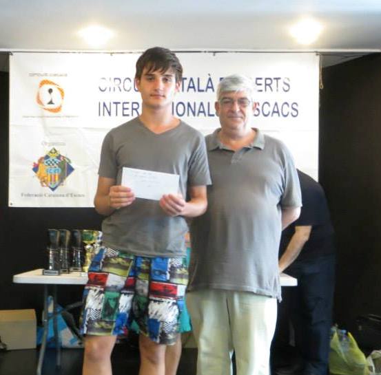 Carlos recibiendo su premio de la mano del presidentede la federación catalana, Toni Ayza La pasada semana se jugaba en Barcelona la 15ª edición del torneo internacional organizado por el club de ajedrez Sant Martí. El abierto se disputa en