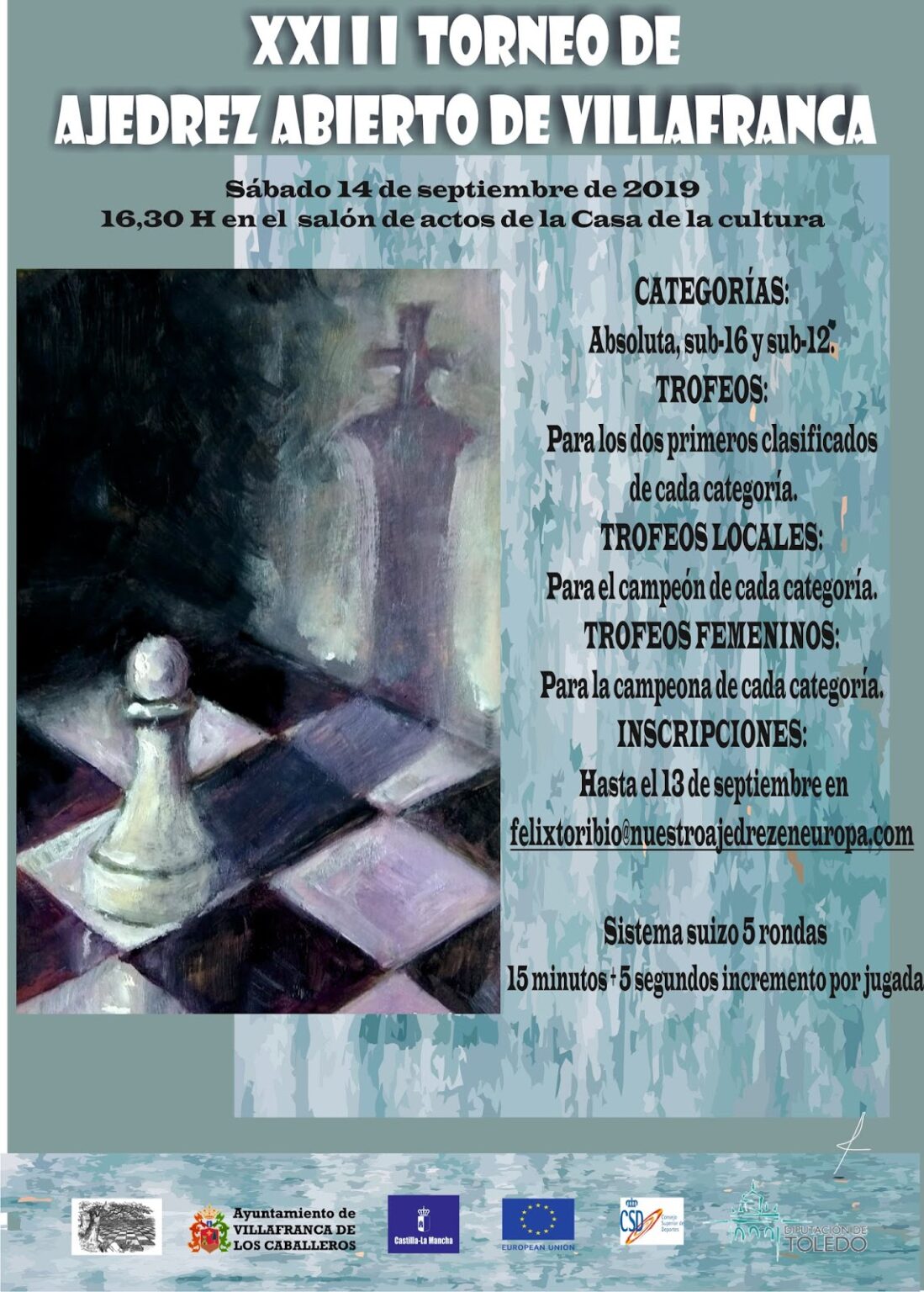 El sábado 14 de septiembre se celebrará la 23ª edición del torneo de feria de Villafranca de los Caballeros. En esta ocasión se realizará en jornada de tarde, comenzando a las 16,30 horas. Las inscripciones se realizan a través del