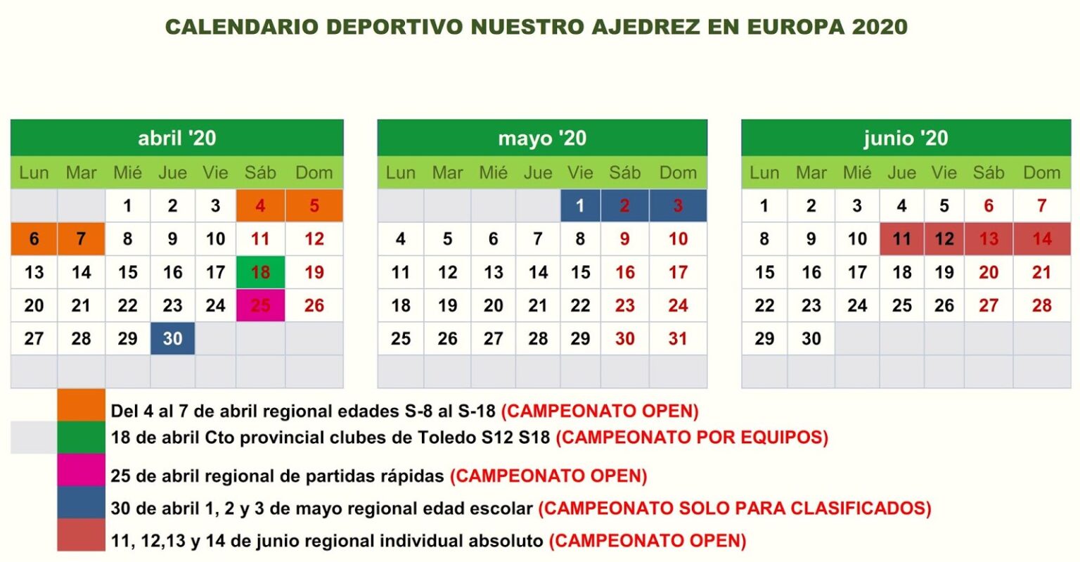 EL CALENDARIO DE CAMPEONATOS ESTÁ SUSPENDIDO QUEDANDO PENDIENTE UNA NUEVA PROGRAMACIÓN UNA VEZ SUPERADO EL ESTADO DE ALARMA Publicamos el calendario oficial de competiciones previstas en la provincia de Toledo y en la comunidad de Castilla-La Mancha para los próximos