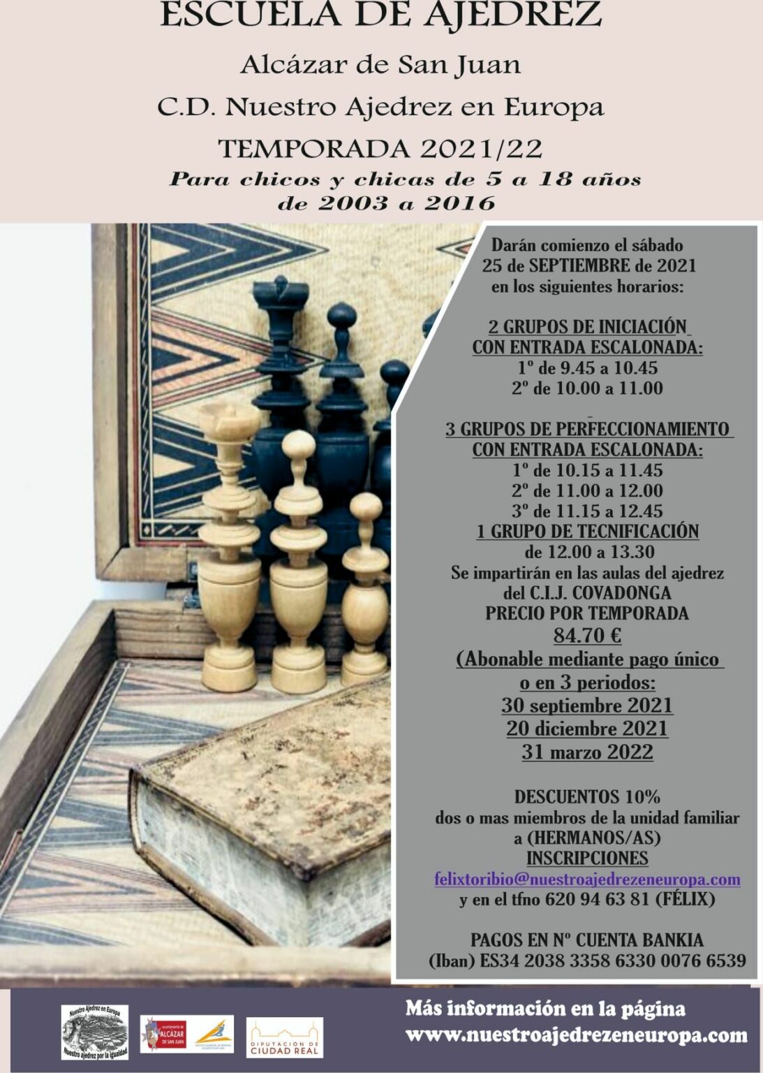 Durante la 2ª quincena de este mes de septiembre ya se pueden realizar las inscripciones para la Escuela de Ajedrez de Villafranca, a través de la web: Ayuntamiento Villafranca de los Caballeros Inicialmente, se han creado 3 grupos: iniciación, perfeccionamiento