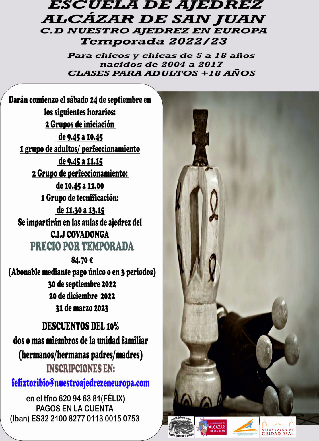 Ya se encuentra abierto el periodo de inscripción a las escuelas de ajedrez de Alcázar de San Juan y Villafranca de los Caballeros para la nueva temporada 2022/23. Las clases en ambas escuelas comenzarán el sábado 24 de septiembre, quedando