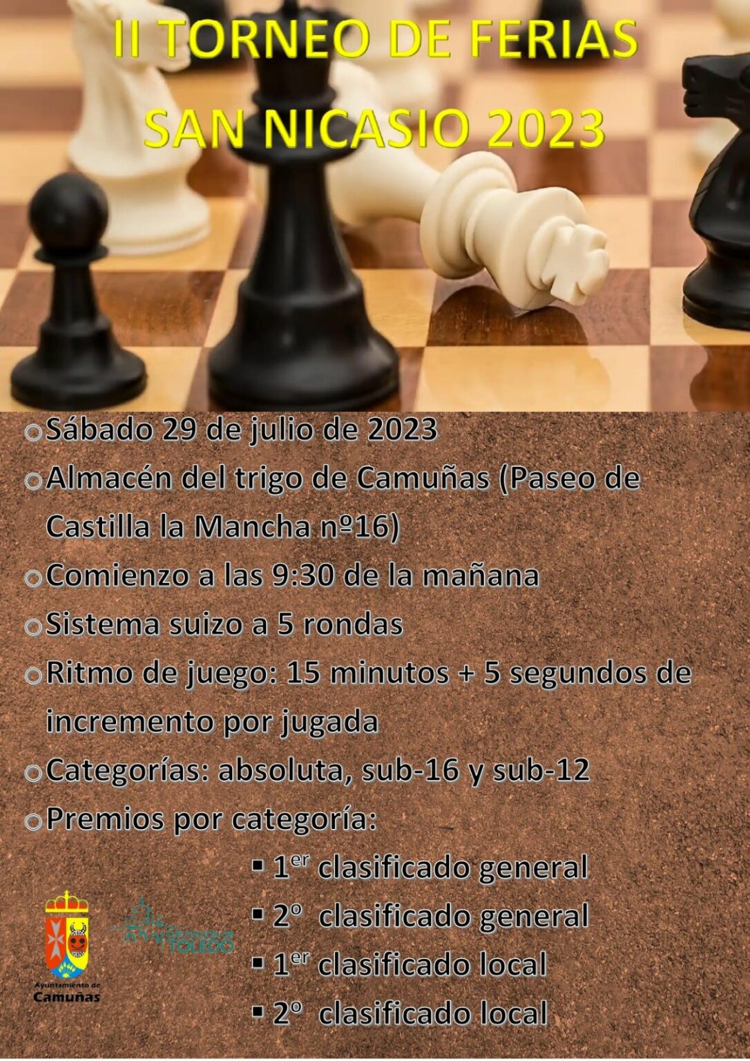 El ayuntamiento de Camuñas junto a la escuela de ajedrez organizan la 2ª edición del Torneo de Ferias de San Nicasio el sábado, día 29 de julio, en el Almacén del Trigo. Las inscripciones están abiertas hasta el 27