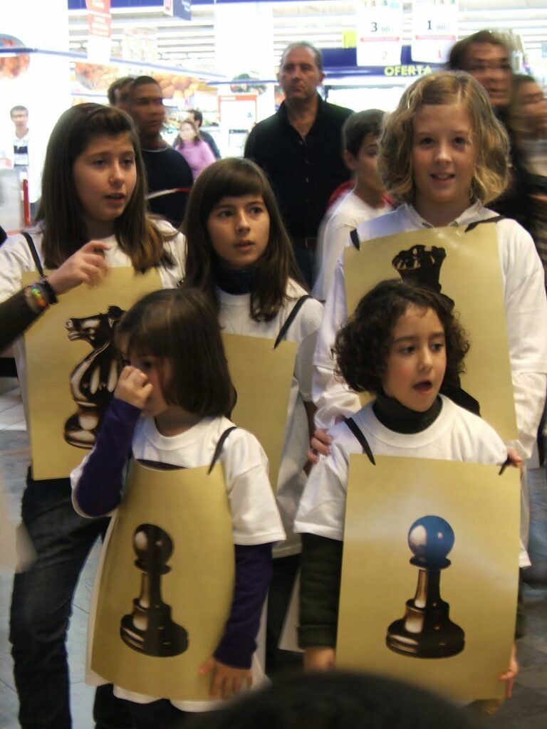 También se jugó una partida con un ajedrez viviente, dentro del cual las piezas eran los niños allí presentes, entre los que señalamos a los que están en la foto, que son : María , Paula, Silvia y destacamos la presencia de otros que no se les ve en ella como Óscar y Alejandro.