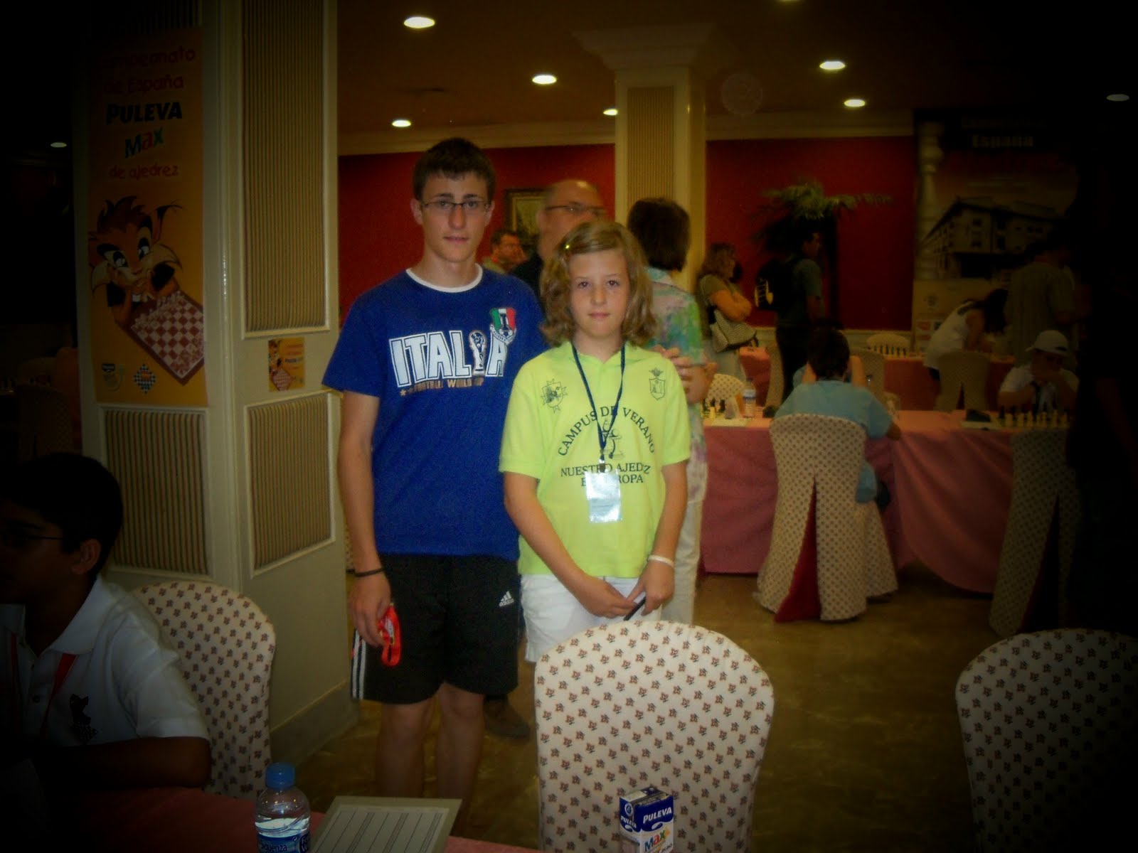 Dentro de estos mismos campeonatos nacionales por edades, el pasado domingo, finalizaba la categoría sub-12, donde estuvo presente como jugadora Silvia Toribio, que en la foto aparece acompañada por Santi Talavera el que ha sido su entrenador durante la competición, habiendo obtenido 2,5 puntos despues de firmar 5 tablas. Al margen de este resultado, la experiencia en la preparación y el aprendizaje ha sido muy positiva para ambos. Continuaremos por este camino, abierto durante esta temporada, en la que los chicos con mayores conocimientos y edad aportan sus entrenamientos a los más pequeños.
