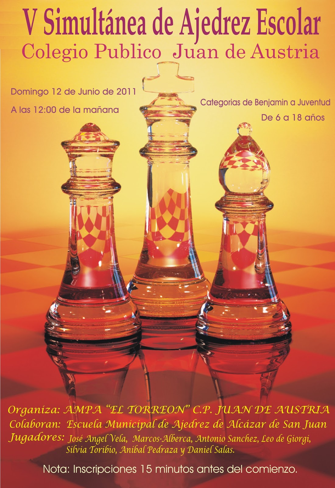 NOTA: También queremos recordaros a todos que, con motivo de estos campeonatos, del torneo de Mora y de otros compromisos relacionados con el ajedrez, este sábado 28 de mayo y el 4 de junio no habrá clases en las escuelas de Alcázar y Villafranca. Como está previsto, en Alcázar se reanudarán el domingo 5 de junio y en Villafranca el sábado 11 de junio en los horarios habituales.