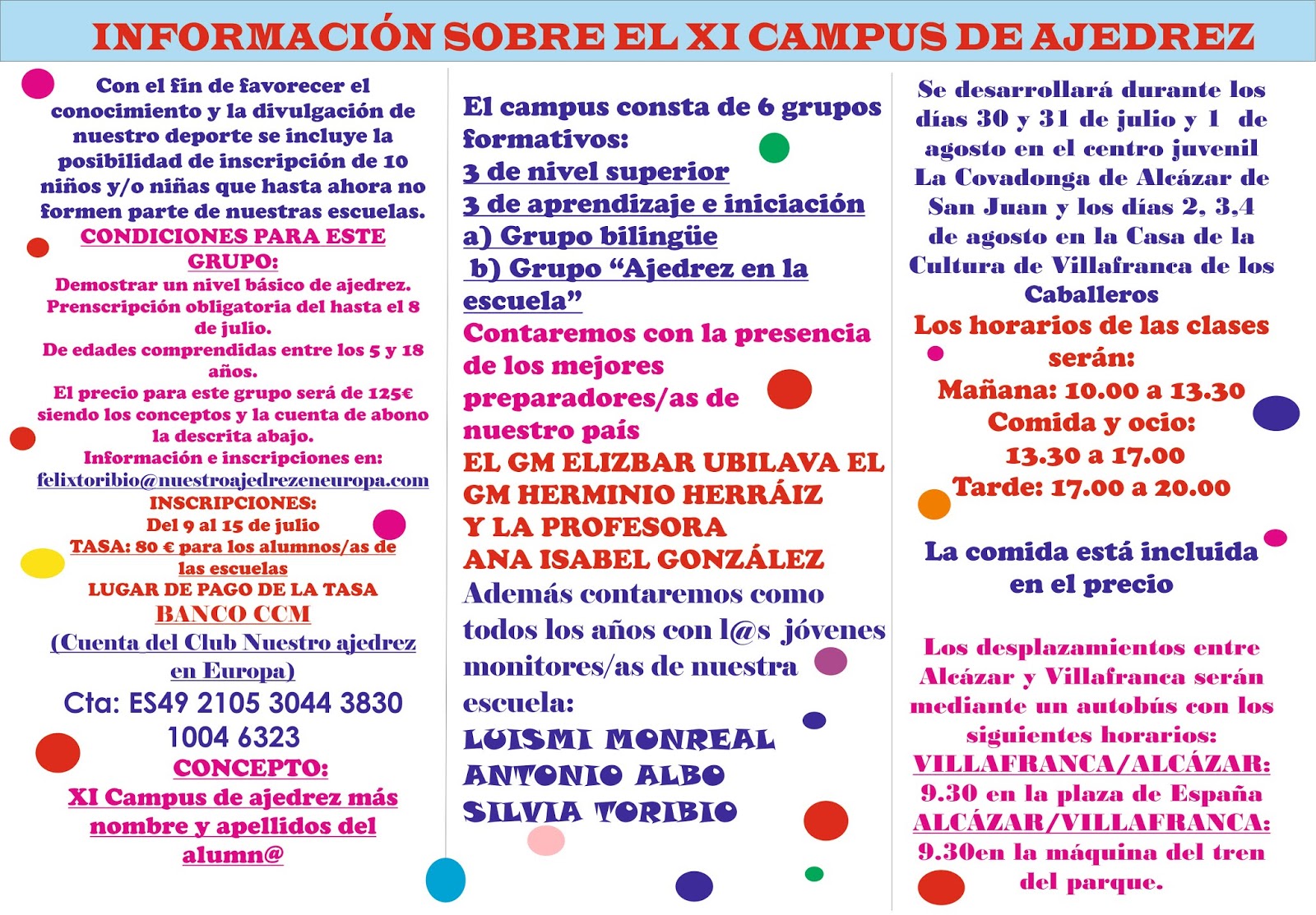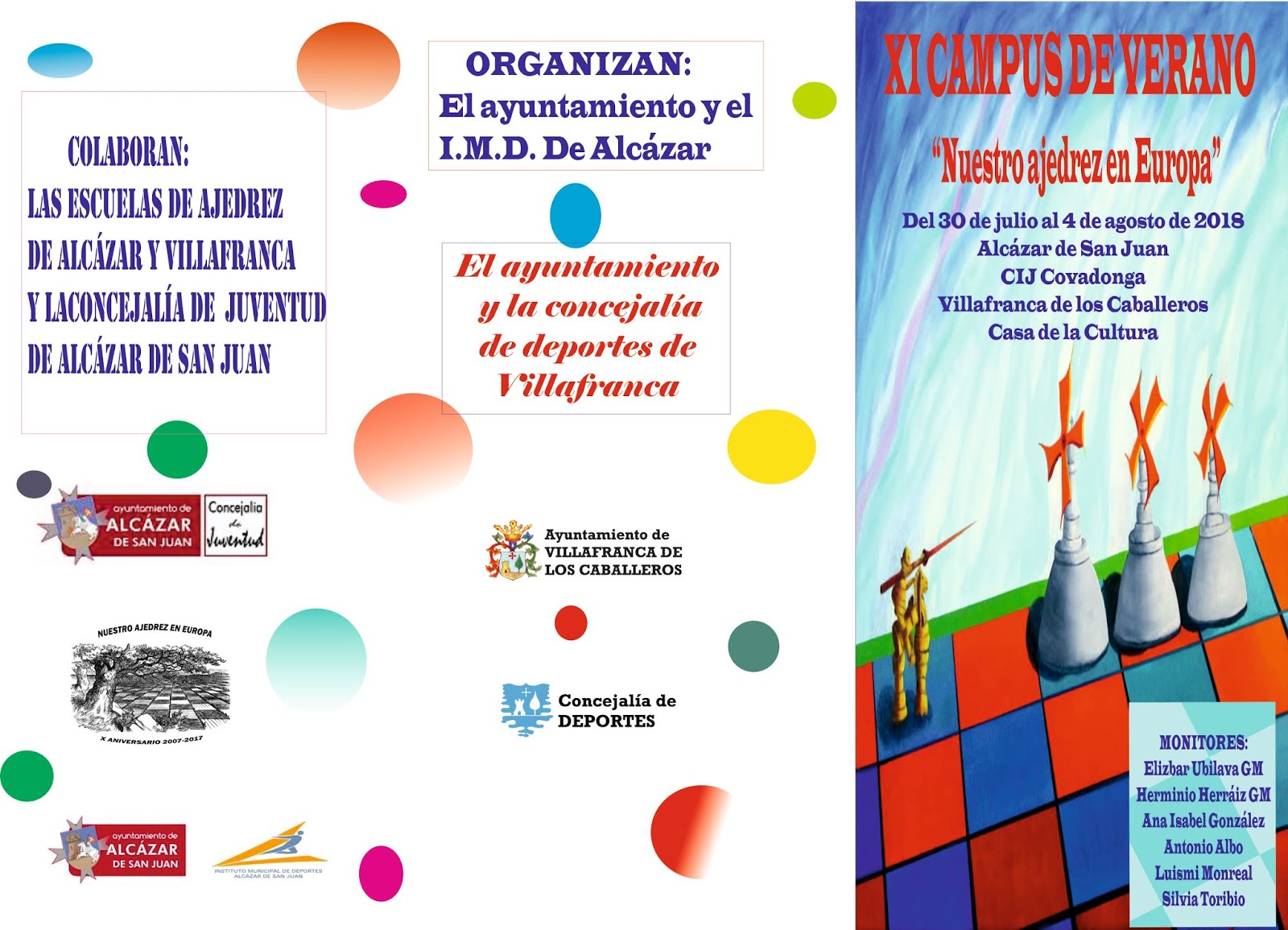A partir del lunes 9 hasta el domingo 15 de julio estará abierto el periodo de inscripciones al XI campus de verano Nuestro Ajedrez en Europa. Como todos los años, las plazas son limitadas y está abierto a la participación de todo el alumnado de las escuelas de ajedrez de Alcázar y Villafranca, así como a chicos y chicas de entre 5 y 18 años que no perteneciendo a ninguna de las dos escuelas quieran tener su primer contacto con el ajedrez o que deseen mejorar técnicamente.