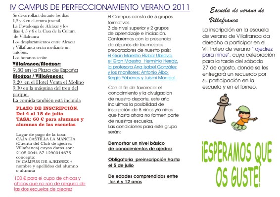 Queremos recordaros que el campus se desarrollará del 1 al 6 de agosto, celebrándose el primer día la inauguración oficial a partir de las 19,30 horas en el salón de actos del Centro Juvenil La Covadonga de Alcázar de San Juan, y la clausura el sábado día 6 a las 8 de la tarde en la sala de conferencias de la Casa de la Cultura de Villafranca de los Caballeros. Para ambos actos la asistencia es libre, congregándose todos los alumnos y alumnas participantes junto a sus familias, además de contar con la presencia de los alcaldes y concejales de deportes de los dos ayuntamientos, así como de representantes oficiales de los organismos que colaboran con nuestro proyecto (Instituto de la Mujer, Diputaciones de Toledo y Ciudad Real y Junta de Comunidades de Castilla-La Mancha).