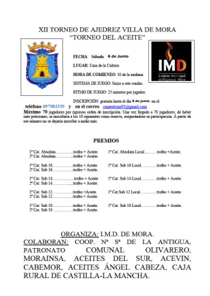 También recordamos que el próximo sábado tenemos una cita con uno de los torneos de semirrápidas de mayor prestigio en nuestra región: el «Torneo del Aceite de Mora» que ya está en su décimo segunda edición.
