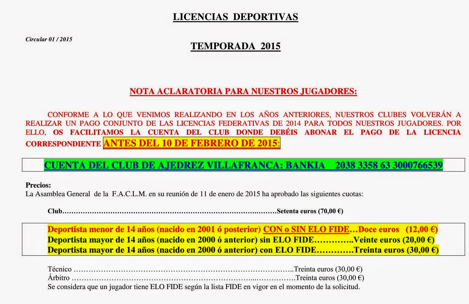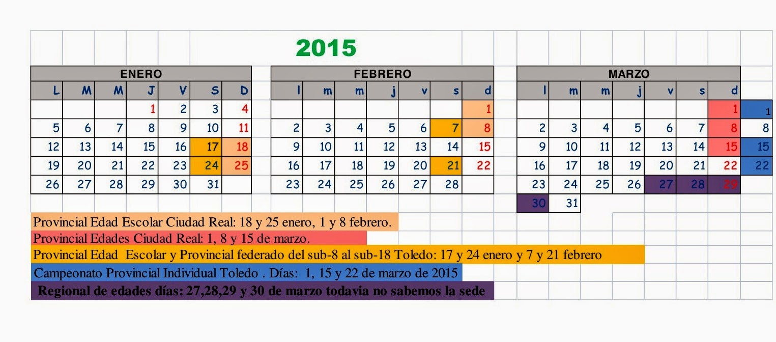 La reciente asamblea de la FACLM ha aprobado el calendario regional de competiciones federadas para 2015 y las tasas para las licencias. Publicamos la actualización del calendario para los meses de enero, febrero y marzo, con la inclusión del Campeonato de Castilla-La Mancha por Edades, aunque pendiente de la asignación de sede.
