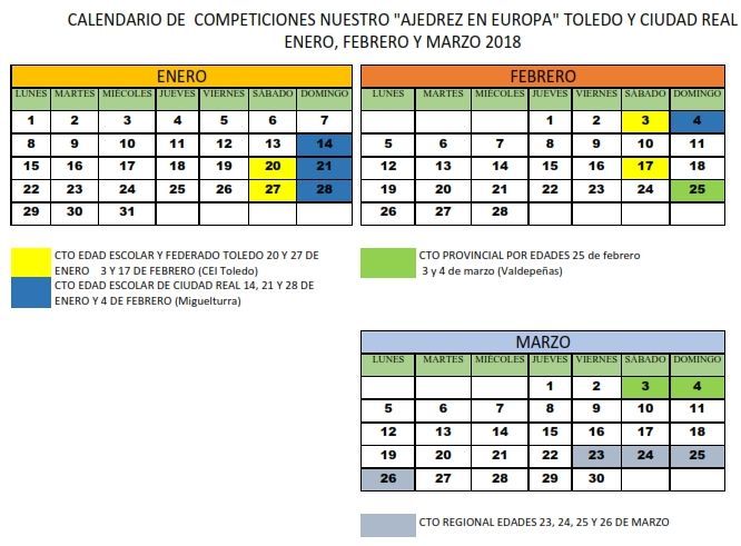 Finalizando el año publicamos el calendario de competiciones previsto para los próximos meses de enero, febrero y marzo de 2018 en las provincias de Ciudad Real y Toledo. Las fechas señaladas para el CRDEE de Ciudad Real (Campeonato Deporte en Edad Escolar Fase Provincial) afecta a los alumn@s de nuestras escuelas en Alcázar de San Juan y Herencia, así como las indicadas para el federado por edades que se disputará en Valdepeñas.