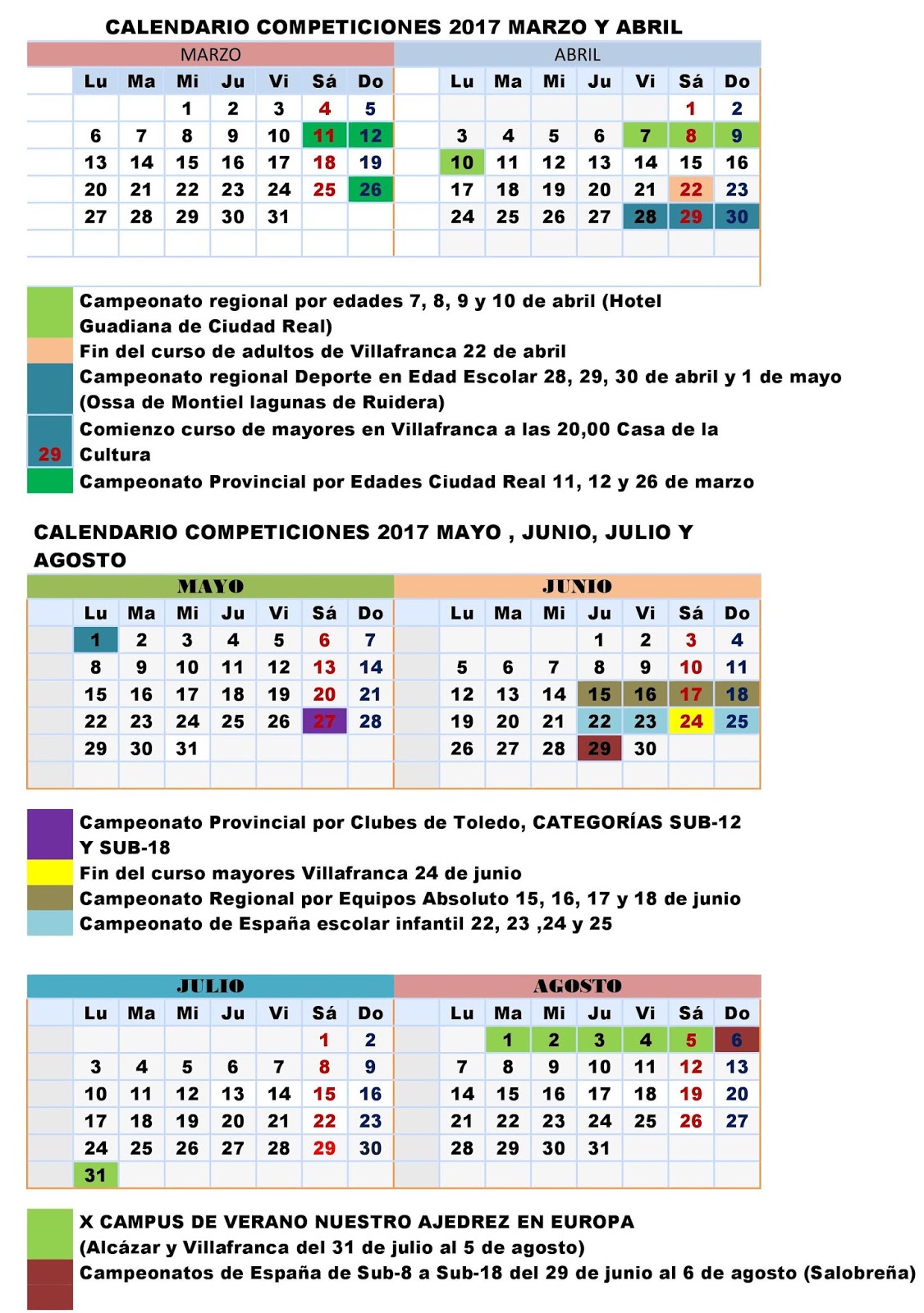 Al objeto de hacer posible una previsión adecuada para todas las familias que participáis en las actividades y competiciones a través de nuestras escuelas y clubes, publicamos el calendario para los meses de marzo, abril, mayo, junio, julio y agosto de 2017.