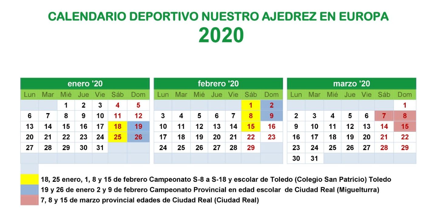 En enero y febrero figuran las fechas definitivas de las fases provinciales del Deporte en Edad Escolar en las dos provincias – en azul claro Ciudad Real y en amarillo Toledo- (recordad que en Toledo es simultáneo el Escolar y el Campeonato Provincial por Edades).