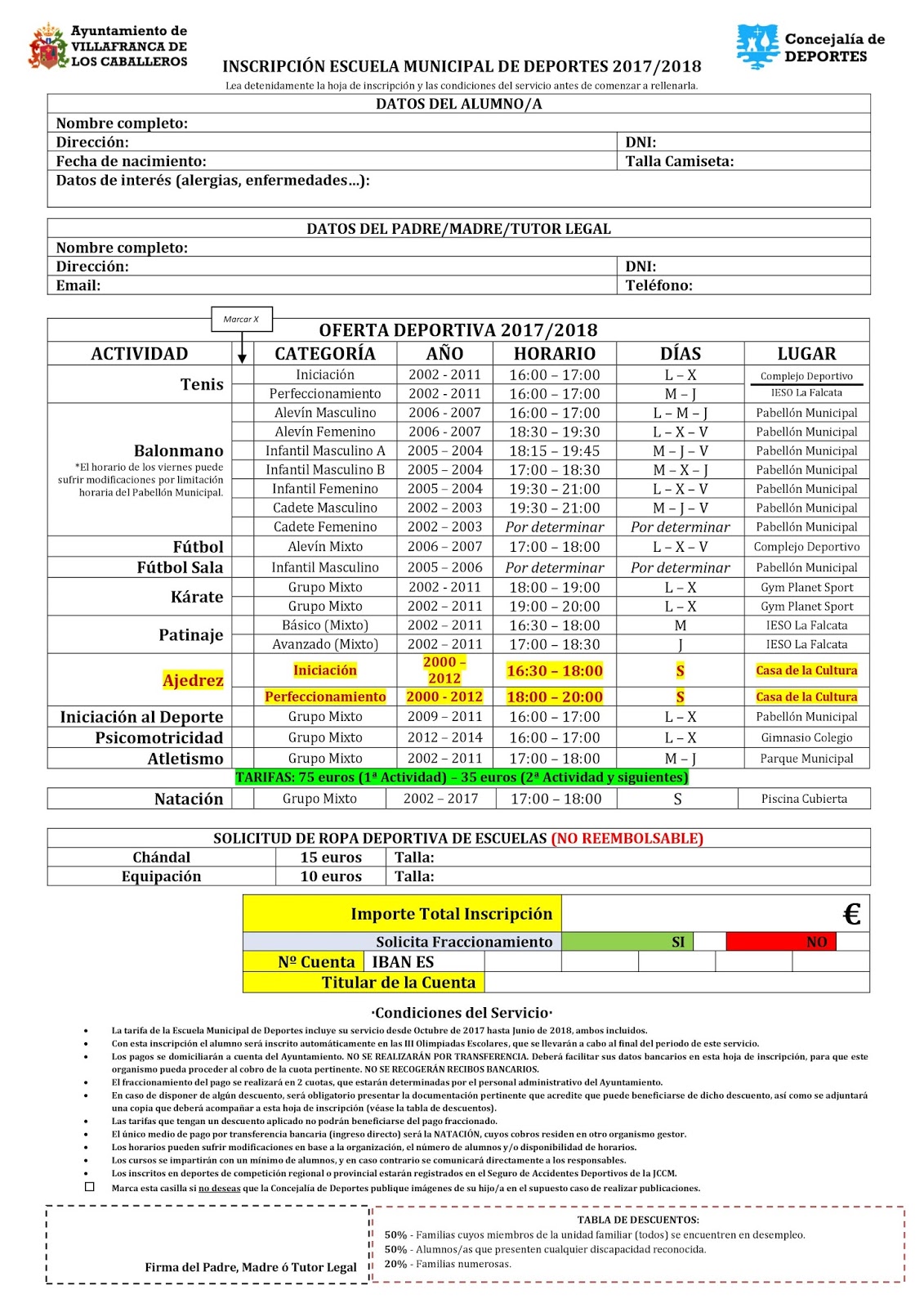 | Hoja informativa Escuelas Deportivas Villafranca. La Escuela de Ajedrez figura en rojo resaltado en amarillo |