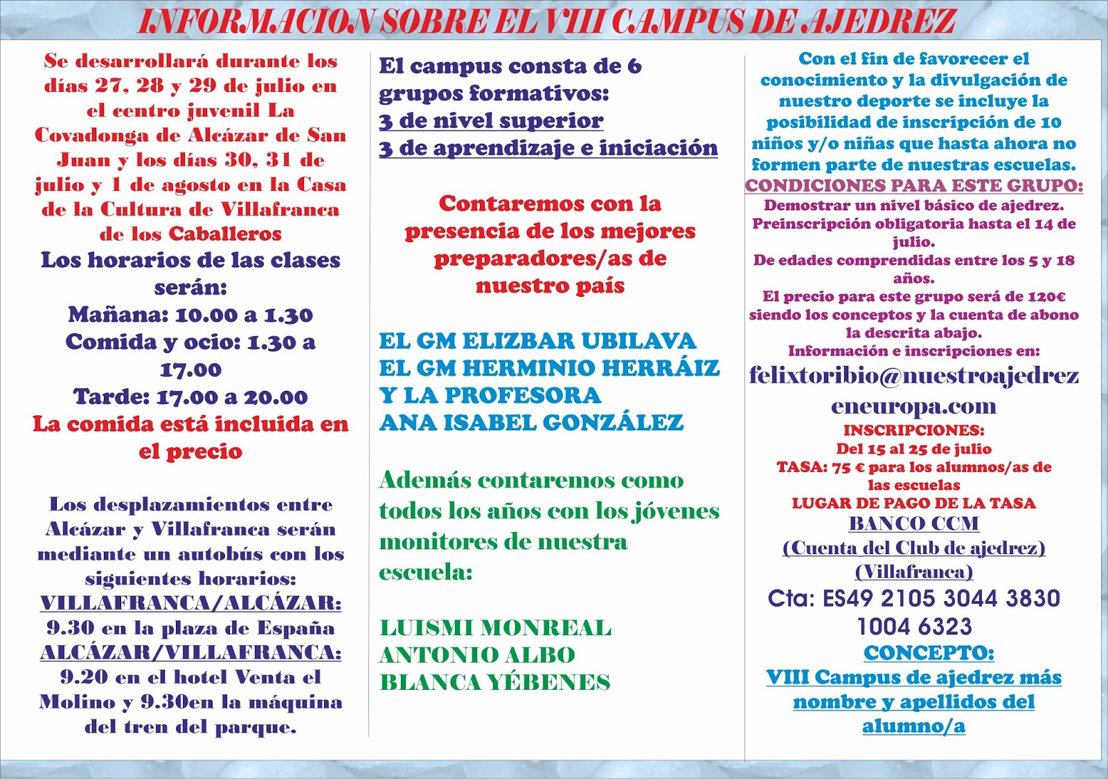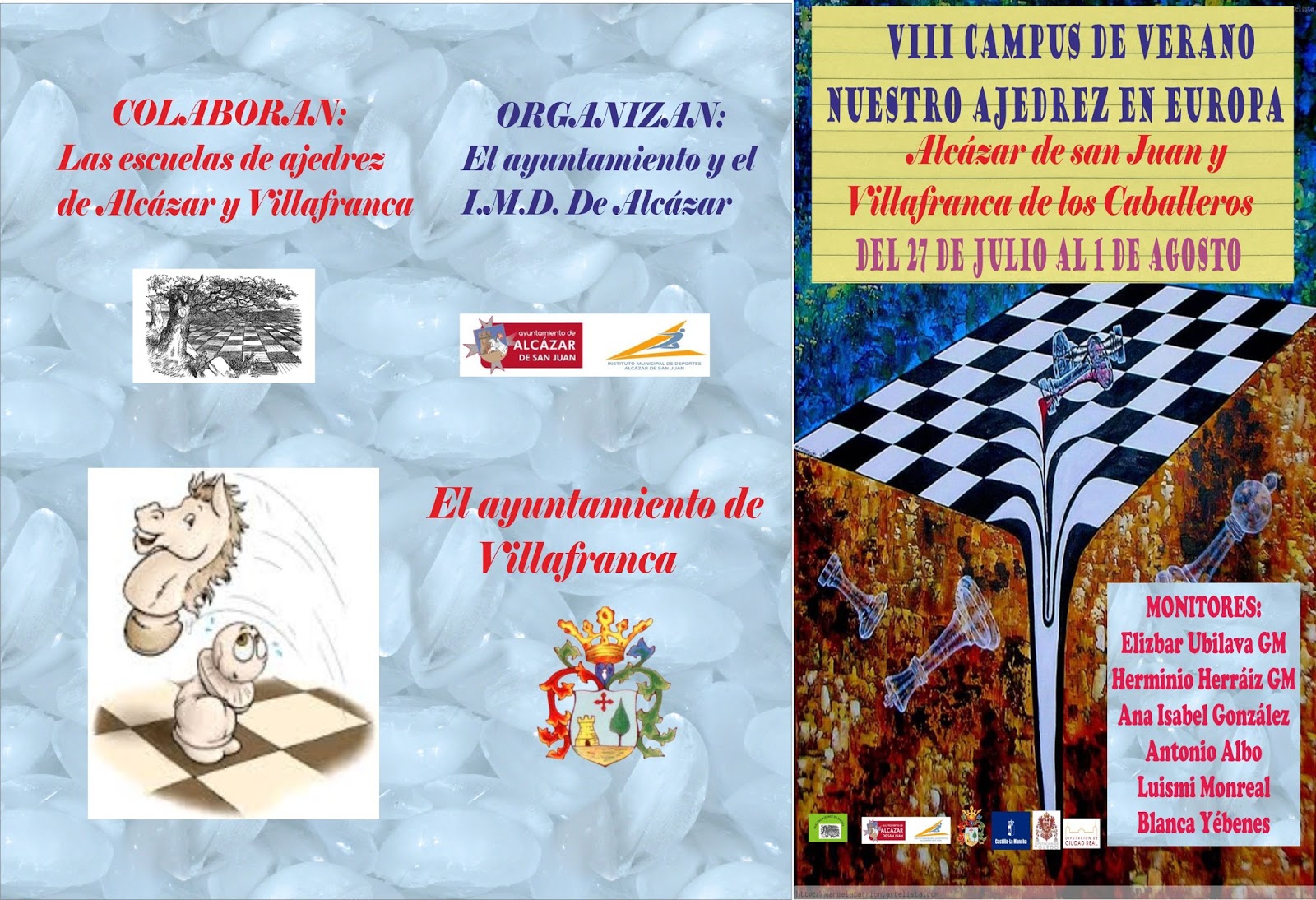 Este fin de semana se han celebrado las reuniones informativas de la octava edición del campus de verano organizado por los ayuntamientos de Alcázar de San Juan y Villafranca de los Caballeros, conjuntamente con el proyecto Nuestro Ajedrez en Europa. El campus se iniciará el 27 de julio en Alcázar y finalizará el 1 de agosto en Villafranca, figurando en el tríptico que publicamos todas las condiciones.