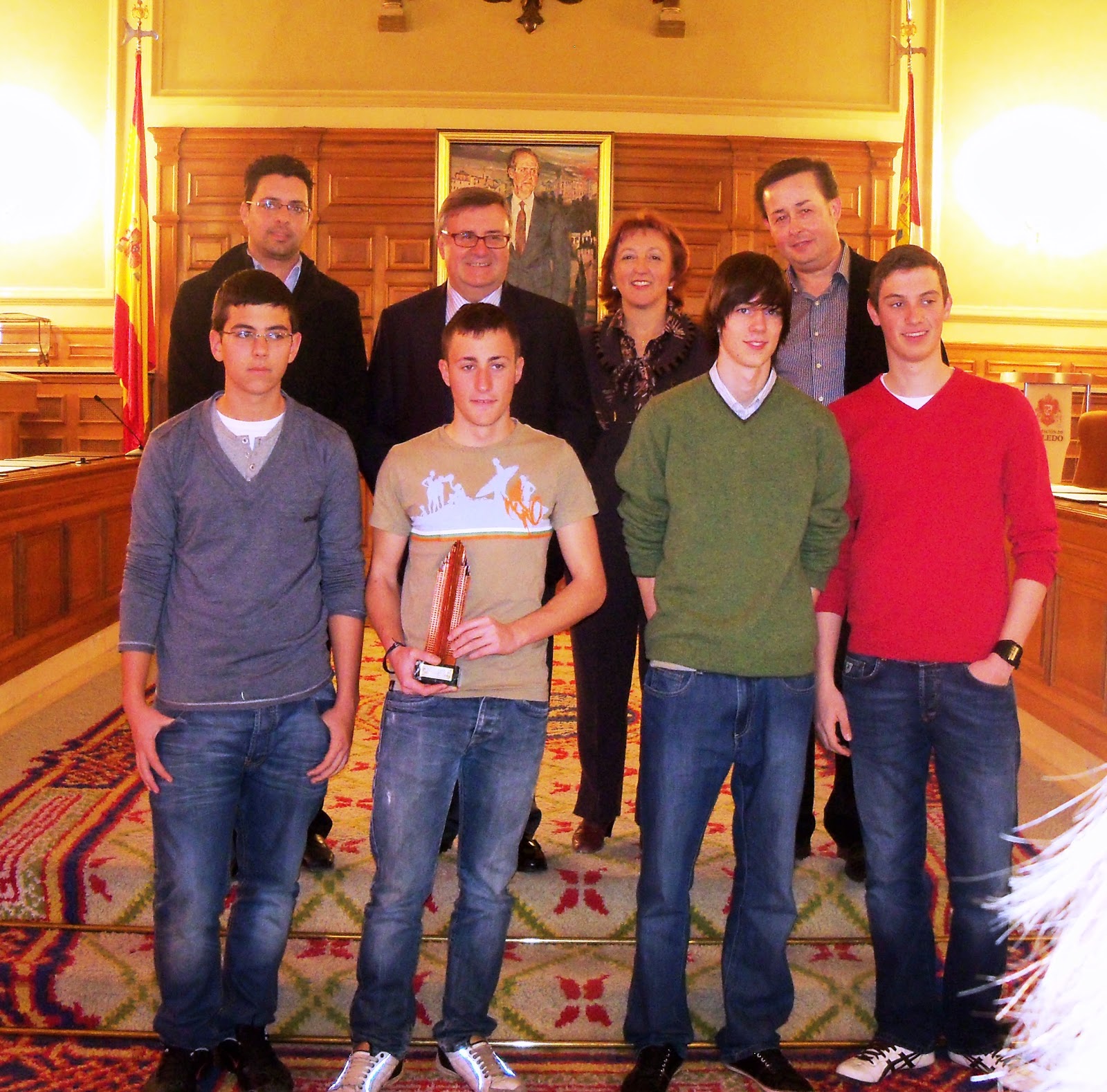 El equipo sub-16 del club NUESTRO AJEDREZ EN EUROPA, ha sido recibido hoy en el salón de plenos de la Diputación de Toledo por su presidente, Arturo García-Tizón, como acto de reconocimiento a la obtención de la medalla de bronce en el Campeonato de España por Equipos 2011 y a los 2 títulos consecutivos de campeón regional de la misma categoría conseguidos en 2010 y 2011. A esta recepción también han asistido la diputada provincial de deportes, Sagrario Gutiérrez, el director general de energía, Luis Manuel Gallego y el alcalde de Villafranca de los Caballeros, Andrés Beldad, además de familiares y amigos de los 5 chicos protagonistas de este gran éxito de nuestro ajedrez. La organización del acto ha correspondido a la presidencia de la Diputación, en colaboración con la alcaldía de Villafranca y con la dirección del proyecto Nuestro Ajedrez en Europa, y ha servido para premiar y valorar debidamente el esfuerzo que estos jóvenes ajedrecistas han venido realizando antes, durante y después de la justa y merecida recompensa de la 3ª posición en la final nacional por clubes.