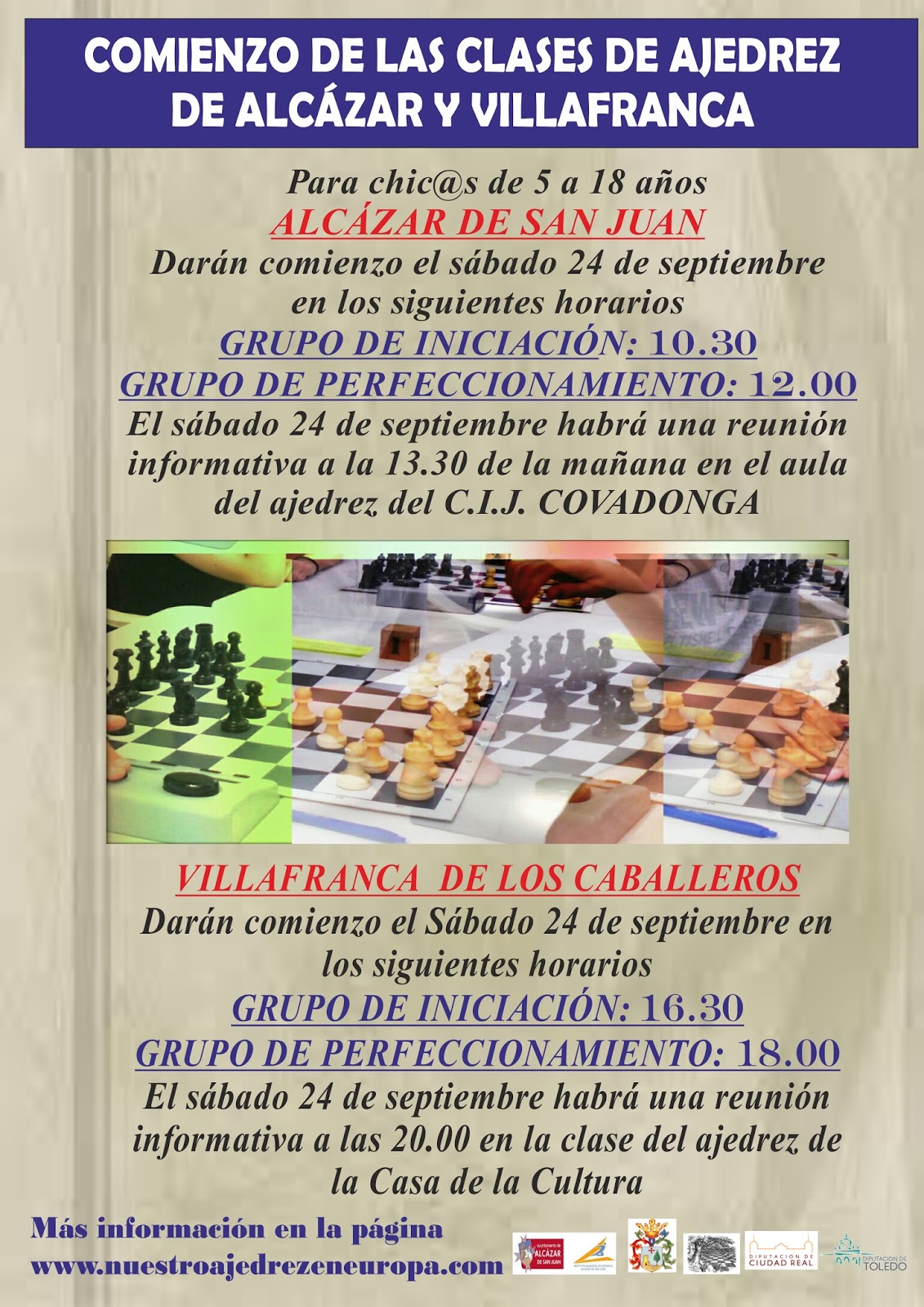 EL SÁBADO 24 DE SEPTIEMBRE VUELVEN LAS CLASES EN LAS ESCUELAS DE AJEDREZ DE ALCÁZAR Y VILLAFRANCA