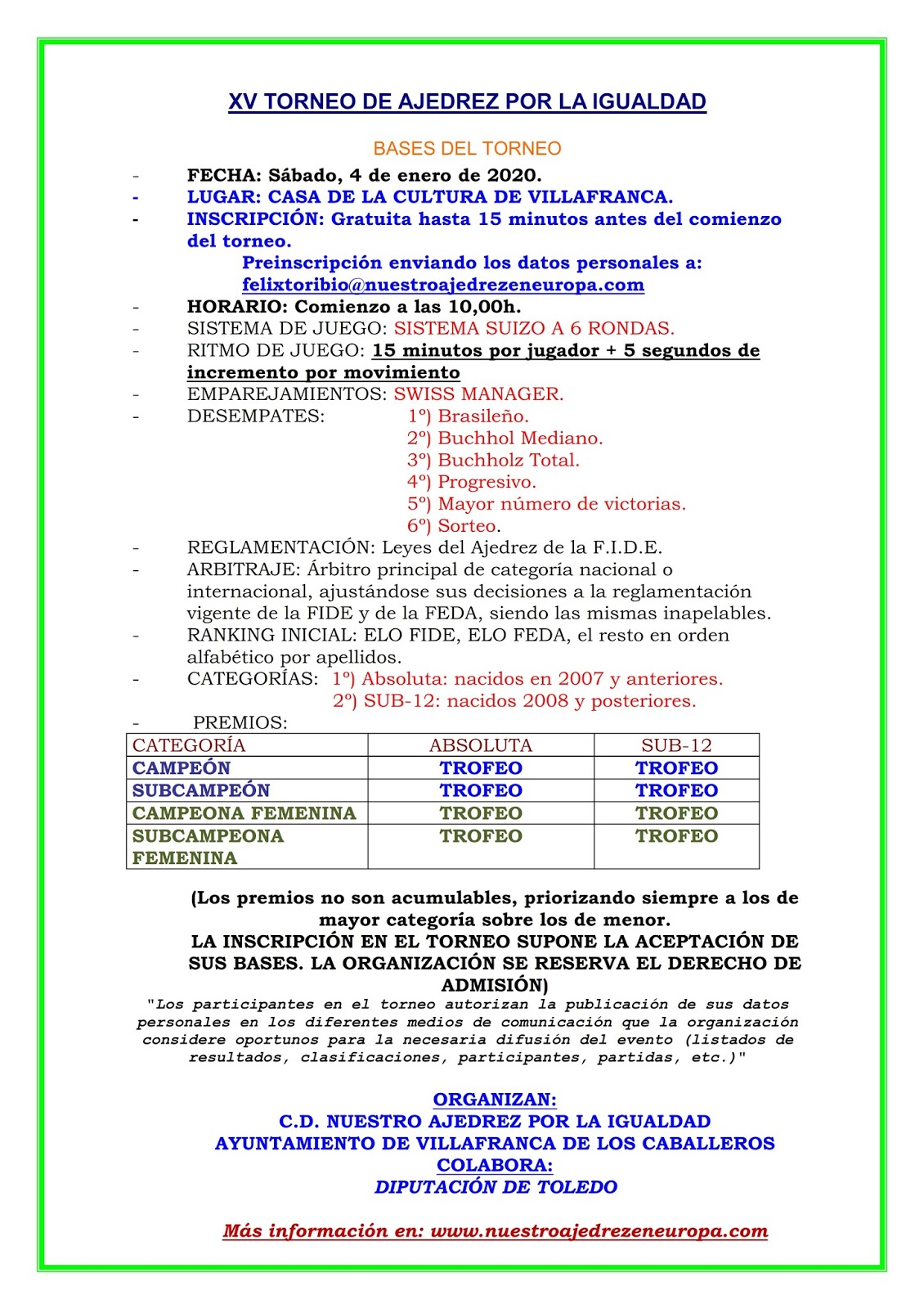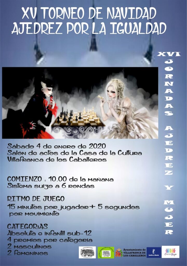 El XV torneo de Navidad «Ajedrez por la Igualdad» tendrá lugar el sábado, 4 de enero de 2020, a las 10 de la mañana, en el salón de actos de la casa de la cultura de Villafranca de los Caballeros. Los 8 trofeos que componen los premios se repartirán entre la categoría absoluta y la sub-12 a razón de 2 masculinos y 2 femeninos por cada una de ellas.