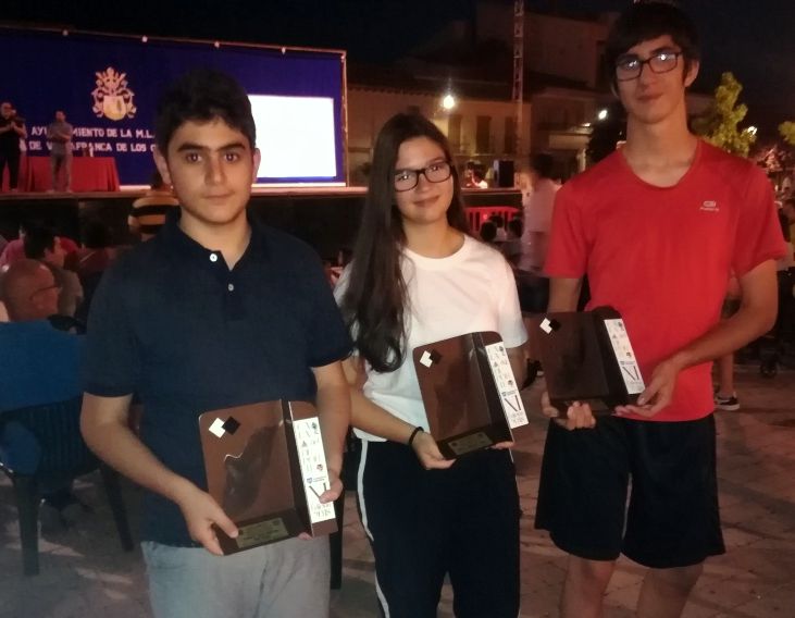 El domingo 24 de junio la plaza de España de Villafranca de los Caballeros recibía la visita de una amplia representación de los jóvenes deportistas que compiten en sus escuelas deportivas y en sus clubes. En la parte que toca al ajedrez de Villafranca l@s premiad@s fueron 3 jugadores que pertenecen a los equipos sub-18. De Nuestro Ajedrez en Europa: Mónica Monreal Gómez y Roberto Yeghiazaryan Petrosyan; y de Nuestro Ajedrez por la Igualdad: Pablo Vela Adrián.