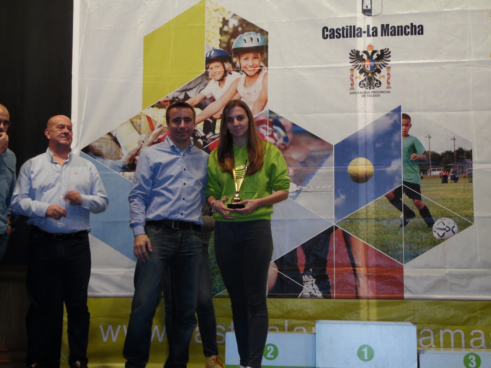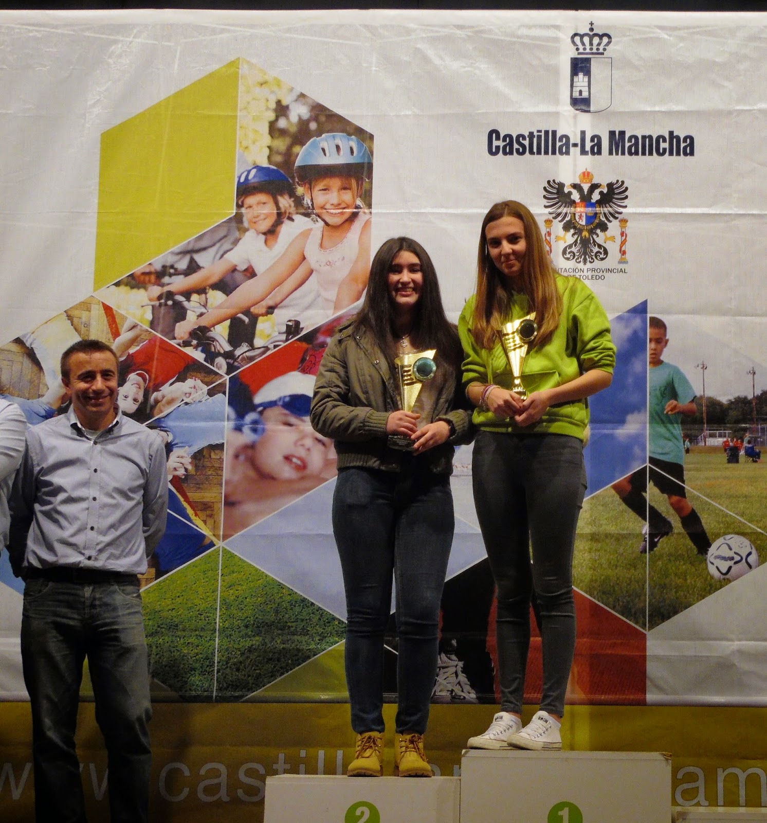 | María y Julia, a izquierda y derecha de la imagen, en el escenario de la casa de la cultura de Mora reciben sus premios |