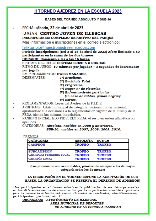 El sábado 22 de abril los aficionados al ajedrez de cualquier edad tienen una cita para disfrutar de su deporte preferido en el II Torneo del Ajedrez en la Escuela que se celebrará en el Centro de Creación Joven de Illescas. En esta ocasión se presentan dos novedades: la primera es la celebración de 2 torneos en paralelo, uno para chicos y chicas de hasta 12 años de edad y el otro para personas de más de 12 años sin límite de edad; a este cambio se une la apertura de la condición de la edad, no estableciéndose edad mínima (pueden participar también el alumnado de infantil) ni edad máxima (al poder participar mayores de 16 años).