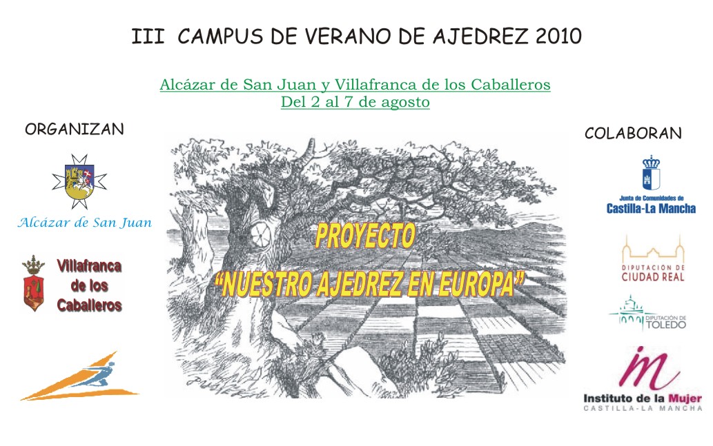 Del 2 al 7 de agosto se celebrará el “III CAMPUS DE VERANO NUESTRO AJEDREZ EN EUROPA” que se desarrollará durante los días 2, 3 y 4 en el Centro Juvenil La Covadonga de Alcázar y los días 5, 6 y 7 en la Casa de la Cultura de Villafranca.