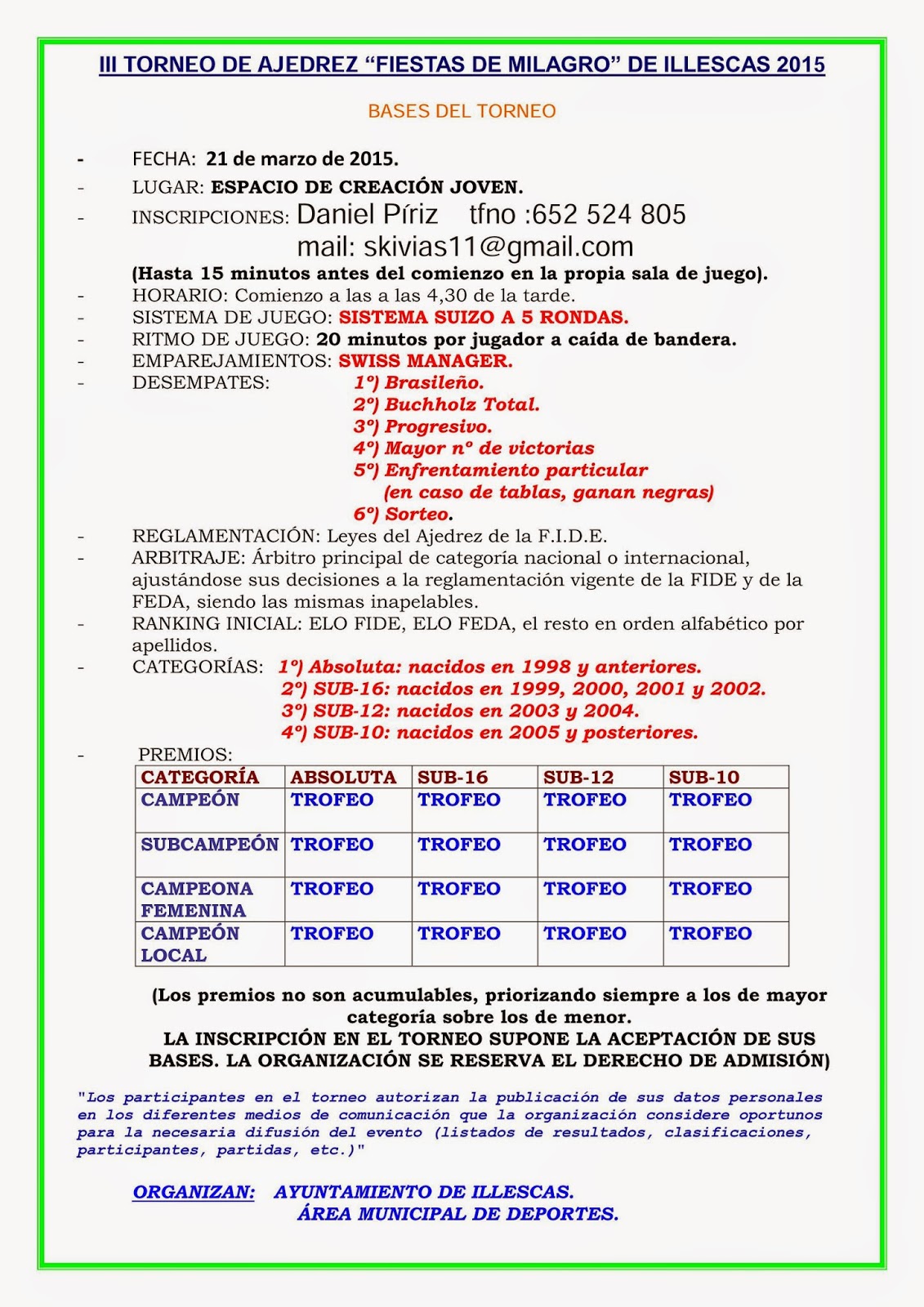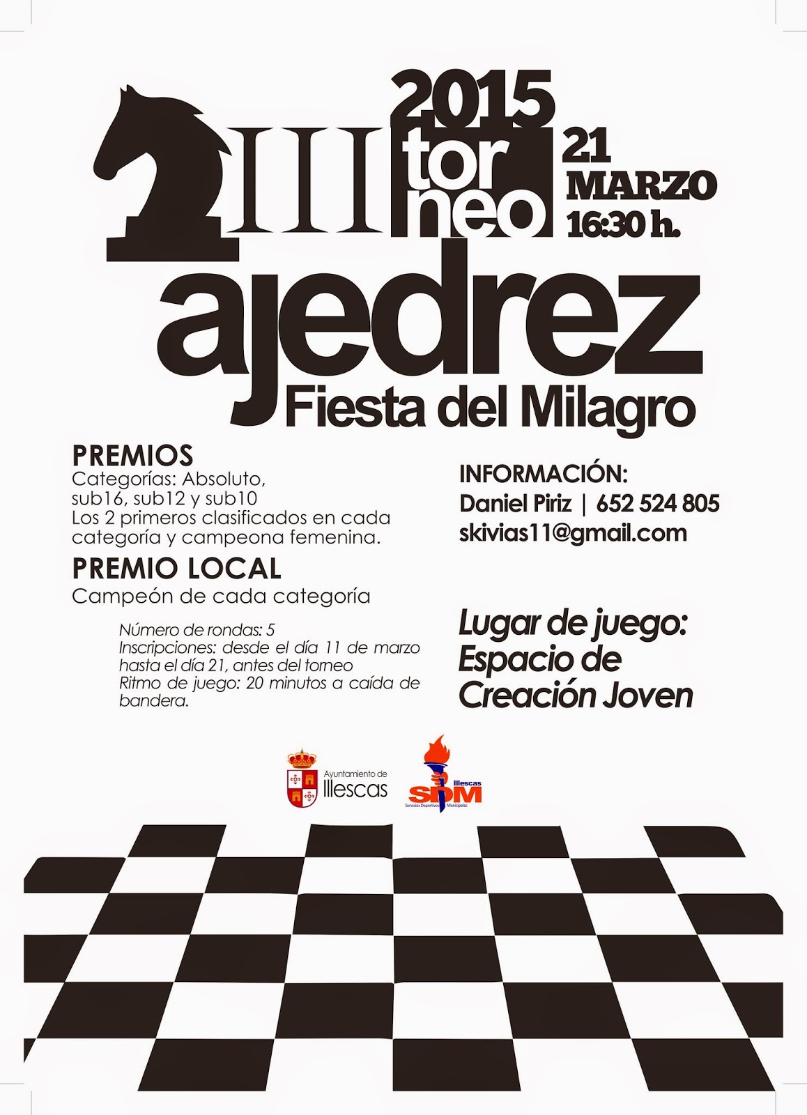 El ayuntamiento de Illescas y su Servicio de Deportes organizan la 3ª edición del TORNEO «FIESTAS DEL MILAGRO» el próximo sábado 21 de marzo en jornada de tarde.Todos los datos podéis verlos en el cartel y en las bases que publicamos en esta noticia. La dirección del torneo corresponde un año más a Daniel Píriz Fernández, que además es el encargado de las pre-inscripciones por correo electrónico o llamando al móvil que se detalla.