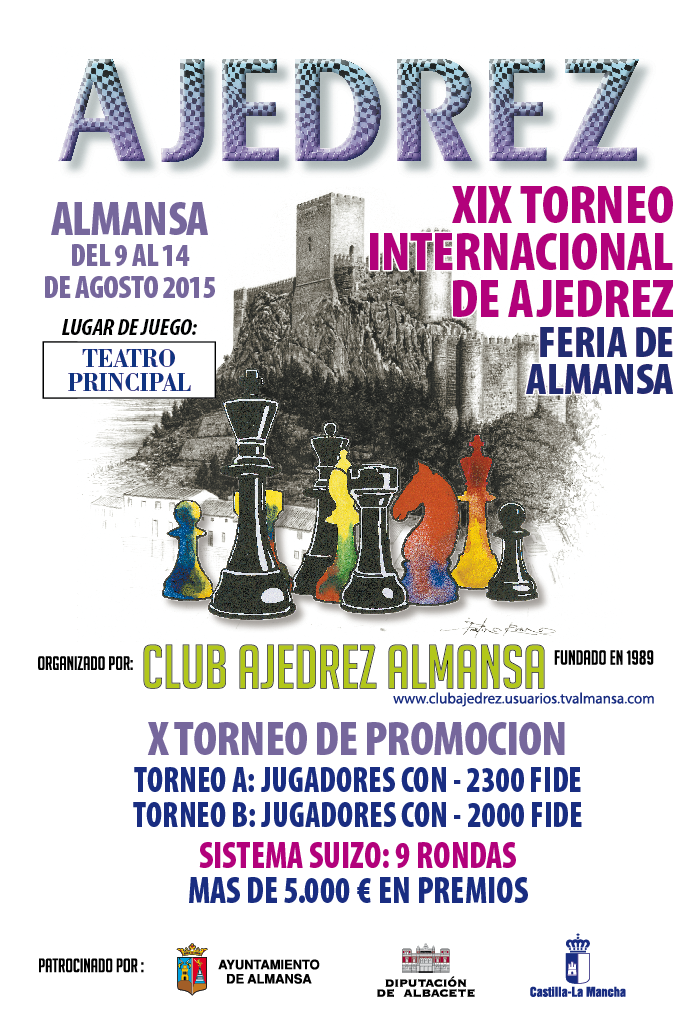 Hoy comienza en la localidad de Almansa (Albacete) la décima edición del Torneo de Promoción que se jugará hasta el próximo viernes 14 de agosto. Dentro del Torneo para jugadores con menos de 2.000 de ELO FIDE son 3 los jugadores de nuestros equipos que se han inscrito: Javier Valdepeñas, Sergio Valencia y Alfredo Amador. Mientras que en el Torneo S-2300 serán Carlos Álvarez e Isaac Lozano, los ajedrecistas de nuestros clubes que participarán este año.