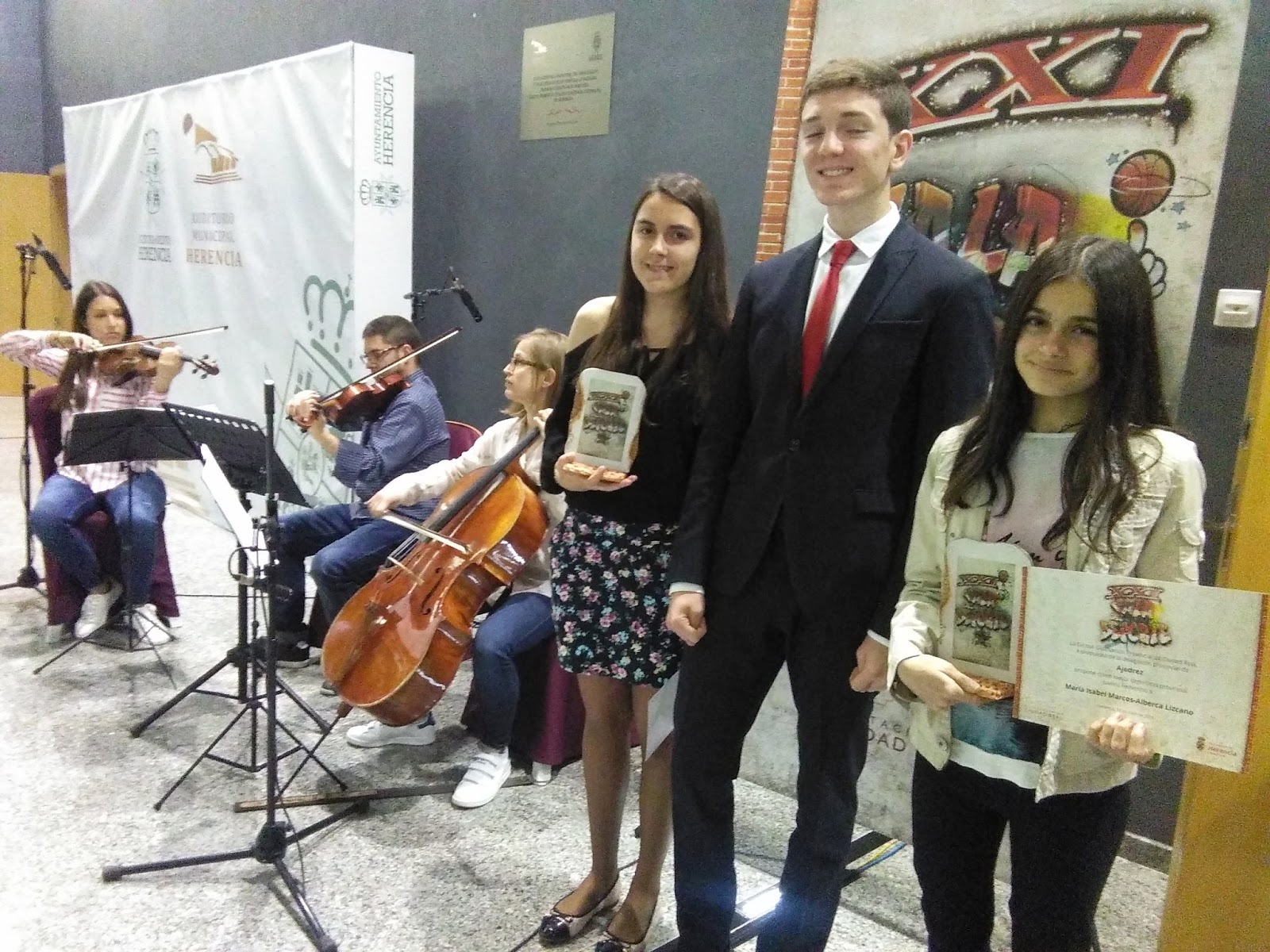 | Isabel acompañada de Miguel y de Esther en el auditorio de Herencia |