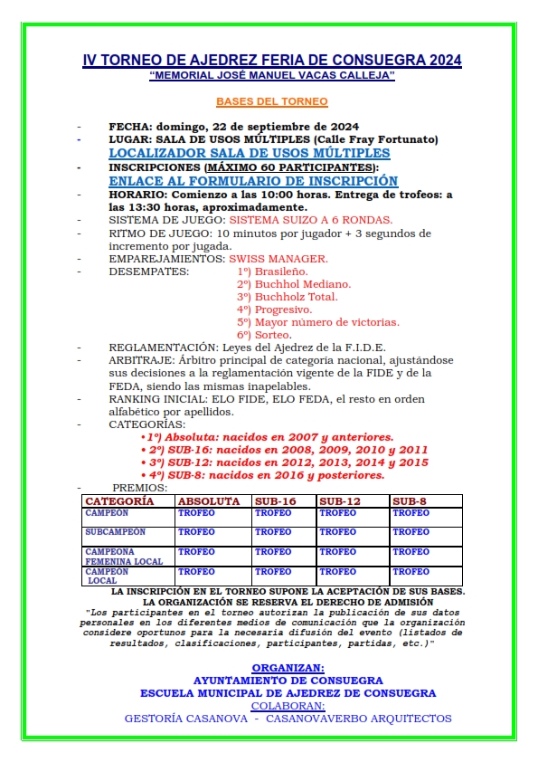 En las bases del torneo tenéis toda la información relativa al lugar de celebración, ritmo de juego, categorías, trofeos y otras características: