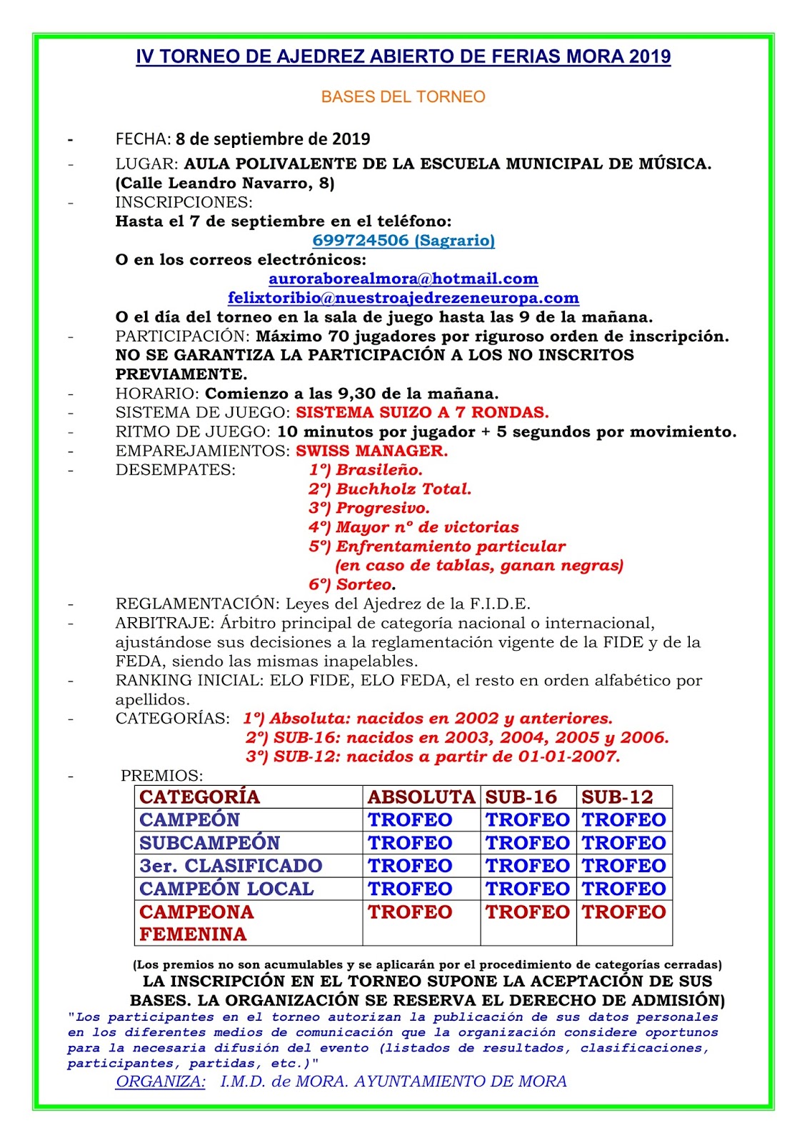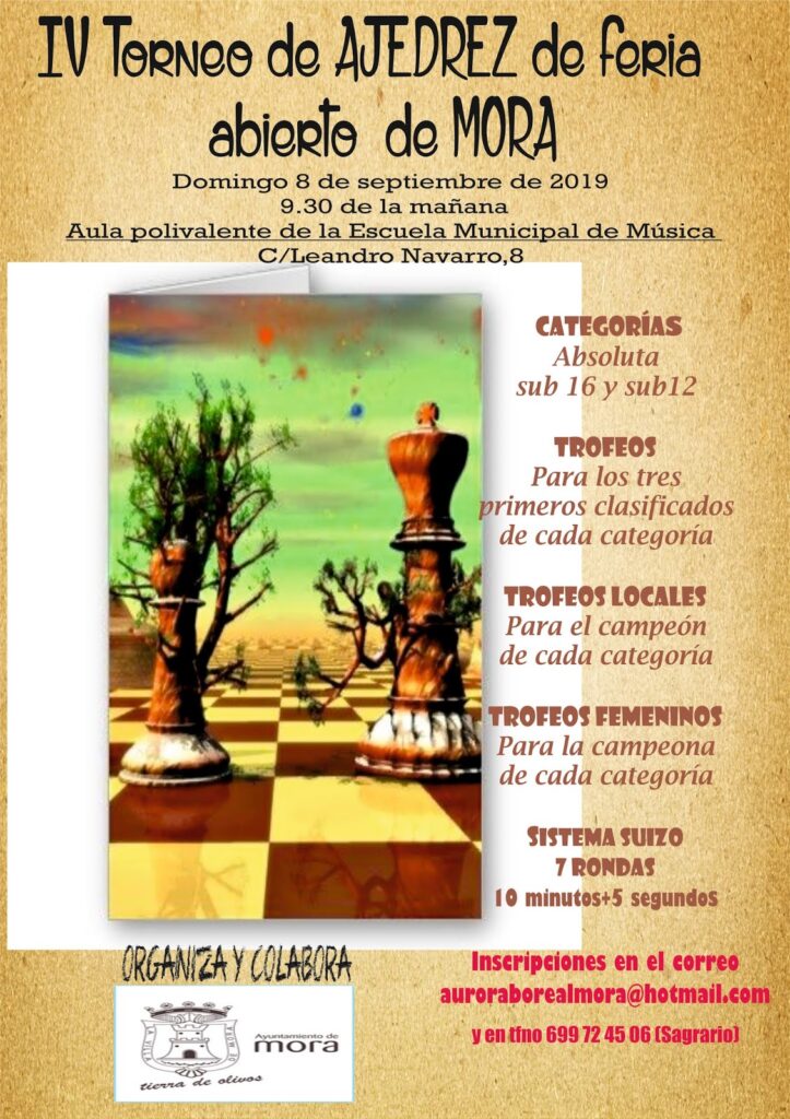 El aula polivalente de la Escuela de Música de Mora albergará la 4ª edición del Torneo de Feria. Esta será la primera ocasión en la que la Escuela de Música, sita en la calle Leandro Navarro,8 acogerá el torneo de la feria.