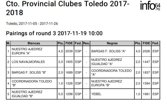 La competición, en cuanto a resultados se refiere en la 1ª ronda, ofreció las victorias de las formaciones «A» de los distintos clubes contra los «B». Por la tarde, tras disputarse la ronda 2, tan solo un par de ellos quedaban con 4 puntos, lo que supone el enfrentamiento entre Nuestro Ajedrez en Europa «A» y Bargas «A» para la 3ª ronda, a celebrar el domingo 19 de noviembre por la mañana. Esta ronda al completo es la siguiente: