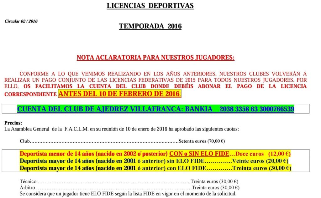 Recientemente se han publicado las circulares de la FEDA y la FACLM relativas a las licencias federativas de 2016. Siguiendo con la línea habitual para el pago de las licencias de los jugadores de nuestros dos clubes, publicamos una circular interna donde facilitamos la información para realizar este abono. Recordad que todos aquellos que disputáis torneos federados, individuales o por equipos, valederos para la temporada 2016, tenéis que tramitar vuestras licencias de acuerdo a lo que señala esta circular.