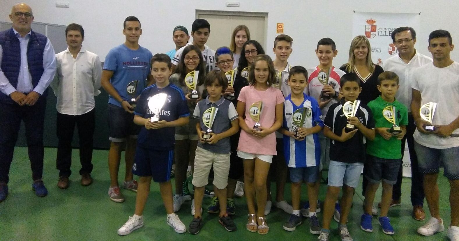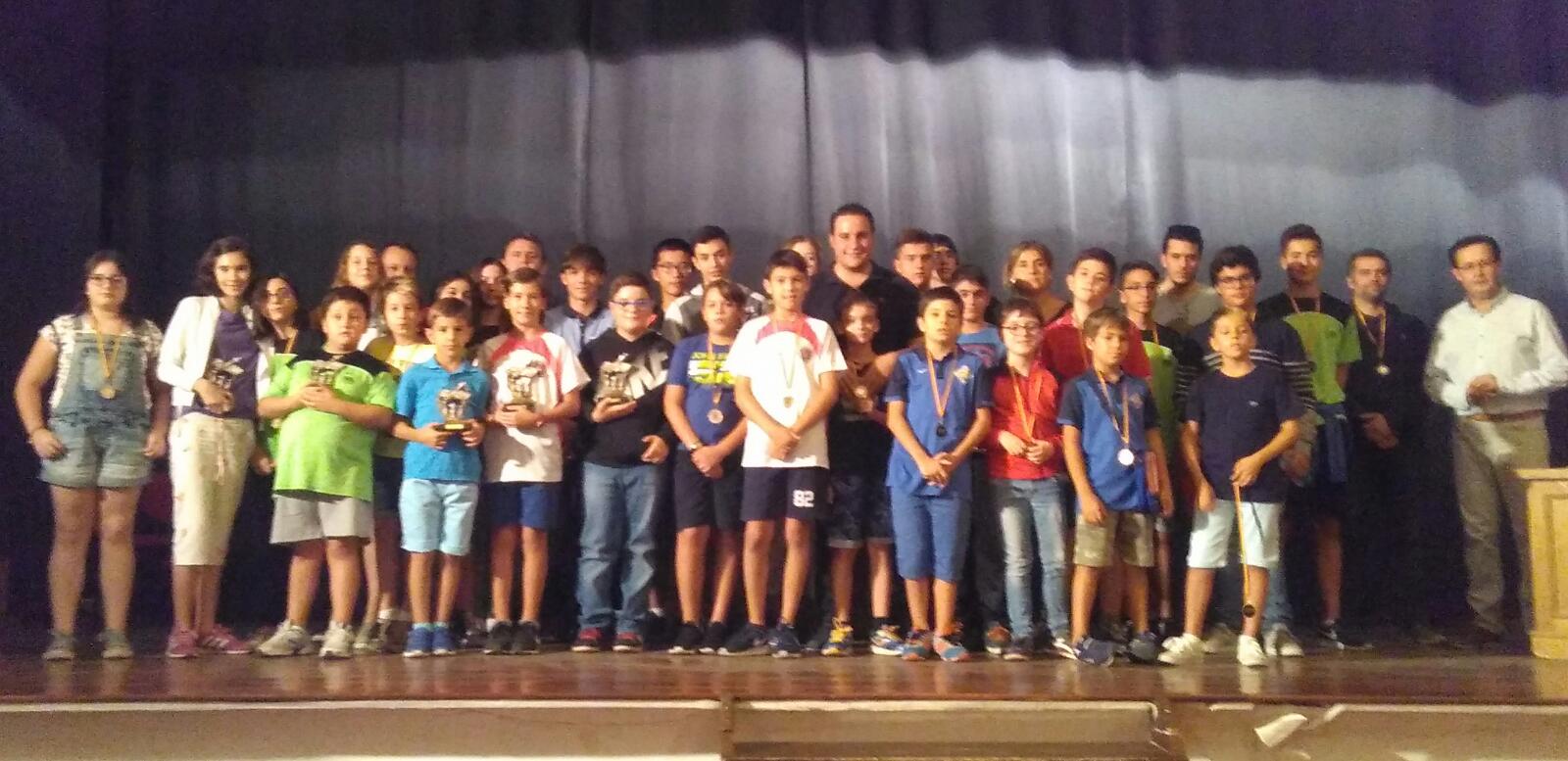 | Premiados y jugadores en el escenario del salón de actos de la casa de la cultura de Mora junto a Sergio Moreno, concejal de deportes |