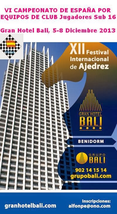 La Federación Española de Ajedrez (FEDA) ha publicado la circular en la que se convoca la sexta edición del CECLUB sub-16 en el lugar acostumbrado, el hotel Bali de Benidorm, y en las fechas de siempre, el puente de la Constitución, del 5 al 8 de diciembre. De nuevo, este campeonato y el resto de competiciones por equipos, son una prioridad para nuestro proyecto. Gracias a la financiación recibida de los ayuntamientos de Alcázar de San Juan y Villafranca de los Caballeros, haremos realidad una importante presencia en este nacional por equipos, compartiéndolo con el objetivo de las actividades formativas específicas de «Nuestro Ajedrez en Europa». En 2 semanas podremos ofrecer toda la información relativa a nuestra participación en este campeonato y en los torneos paralelos por edades, de carácter individual, que organiza este famoso hotel.