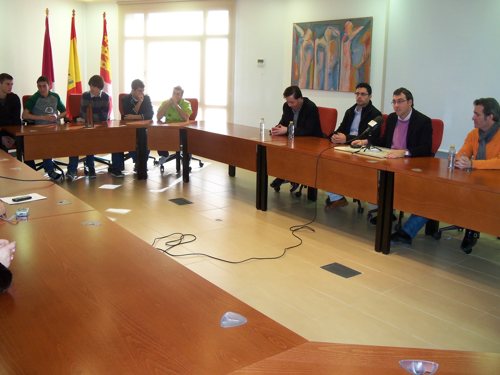 Acaba de producirse la recepción oficial al equipo sub-16 de Nuestro Ajedrez en Europa en las dependencias municipales del ayuntamiento de Alcázar de San Juan. Al acto han asistido los alcaldes de Alcázar y Villafranca, Diego Ortega y Andrés Beldad, el concejal de deportes alcazareño, Manuel de la Guía, y el director del proyecto, Félix Toribio. Los 5 integrantes del equipo clasificado 3º en el reciente Campeonato de España por Equipos: Jorge Simón, Santiago Talavera, José Ángel Vela, Daniel Píriz y Sergio Valencia, fueron recibidos por las autoridades locales en la sala de comisiones, celebrándose a continuación un encuentro con los medios de comunicación. Junto a ellos, han querido presenciar este momento familiares y amigos de los jóvenes ajedrecistas. A continuación se ha celebrado una reunión con la participación de ambos alcaldes, el concejal de deportes y el director del proyecto, donde se ha puesto de manifiesto el apoyo al proyecto pese a los duros momentos económicos que estamos viviendo.