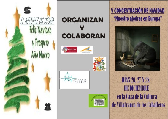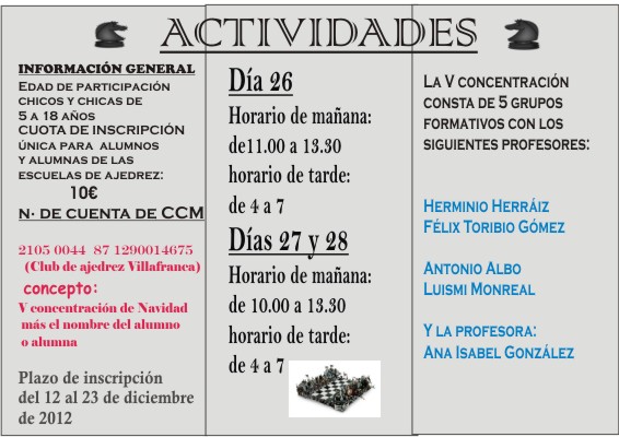 Los días 26, 27 y 28 de diciembre verán la celebración de la «V CONCENTRACIÓN DE NAVIDAD» en la casa de la cultura de Villafranca de los Caballeros. Las condiciones de inscripción, horarios y grupos de preparación figuran detallados en el tríptico que se publica en esta información. En esta ocasión la Concentración se abre también para antiguos alumnos y alumnas de las escuelas de ajedrez de Alcázar y Villafranca en iguales condiciones que las de los actuales. Con 5 grupos diferenciados de aprendizaje y la presencia de Herminio Herráiz y Ana Isabel González, continuaremos en el proyecto de tecnificación y perfeccionamiento de nuestros ajedrecistas, desde los de mayor edad a los más pequeños. ¡¡YA ESTÁ ABIERTO EL PLAZO DE INSCRIPCIÓN!!