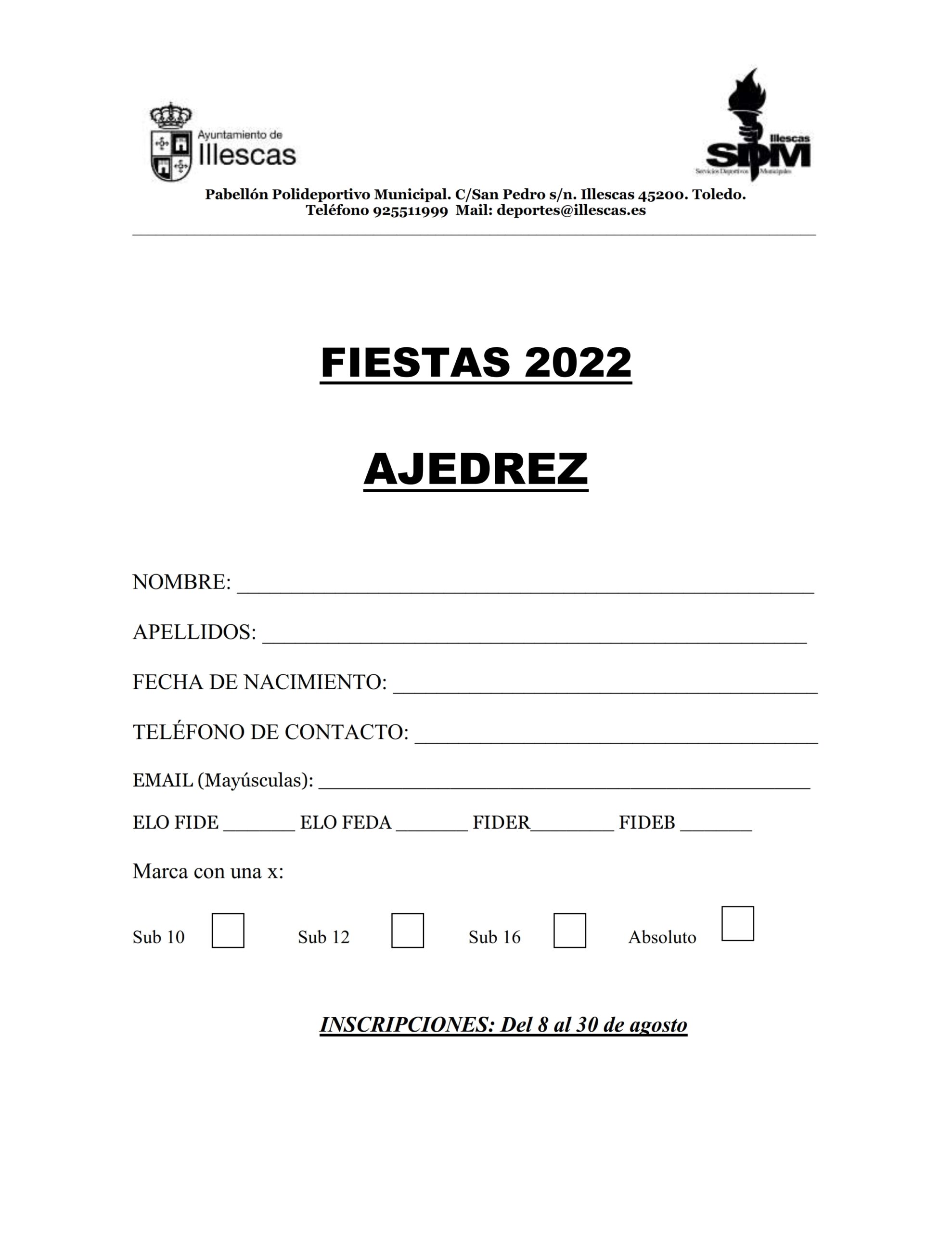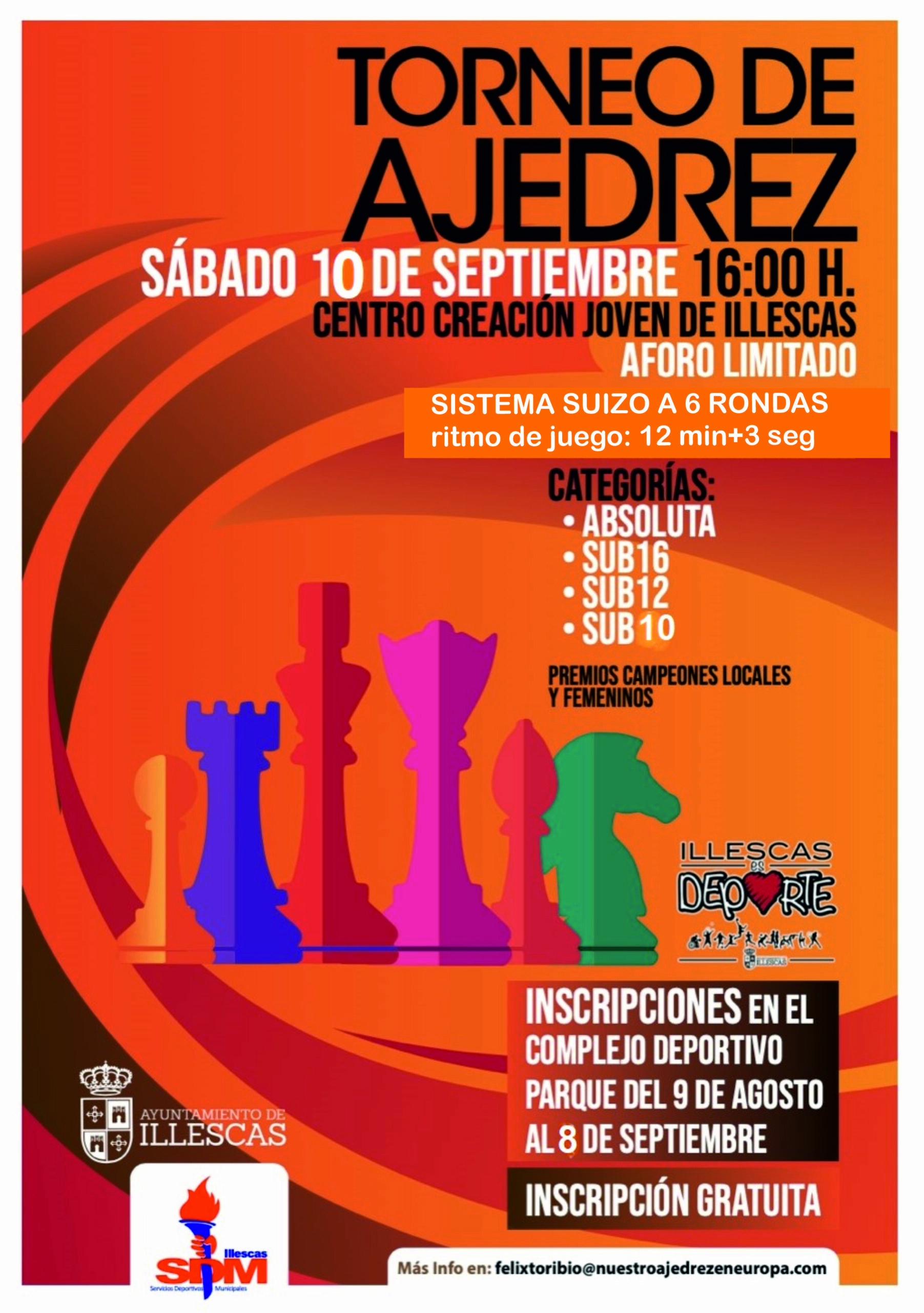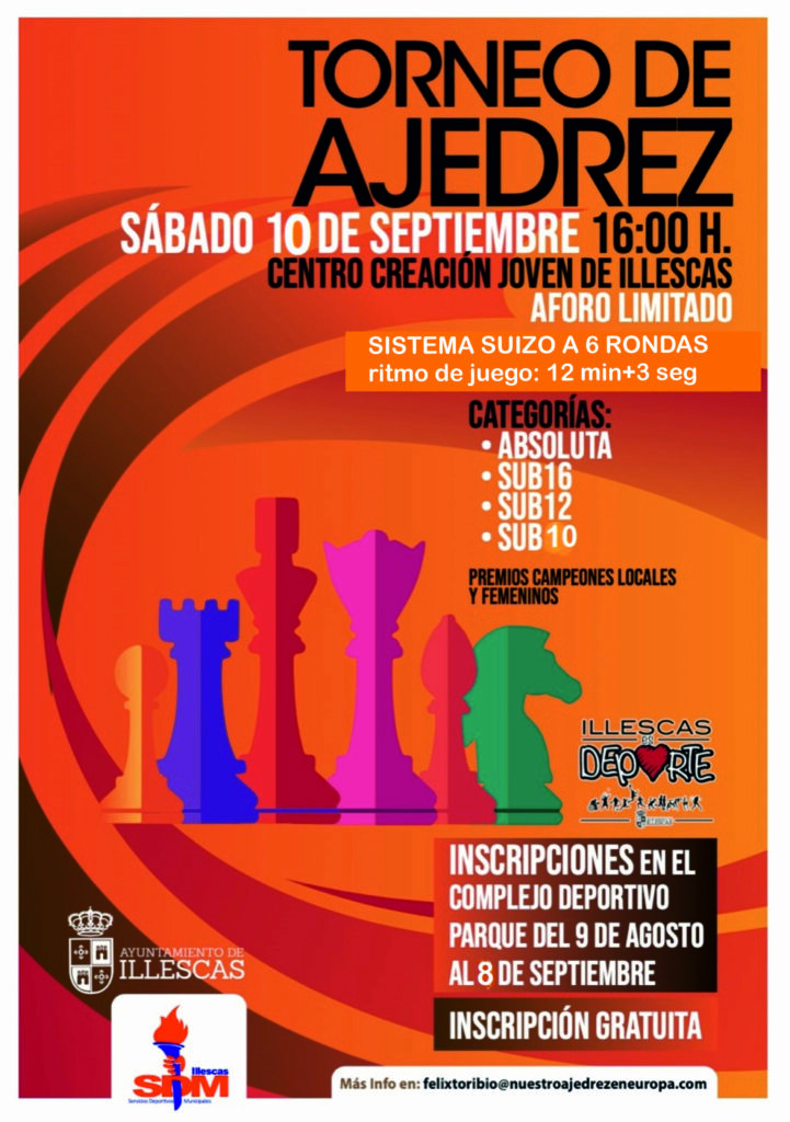 El sábado 10 de septiembre a las 16 horas comenzará el VI Torneo de Feria de Illescas. El Centro de Creación Joven volverá a acoger la celebración del torneo que repartirá trofeos a los 2 mejores clasificados de las categorías: absoluta, sub16, sub12 y sub8, así como a la mejor jugadora clasificada en cada categoría y al jugador local. Las bases y la hoja de inscripción del torneo son las que publicamos a continuación: