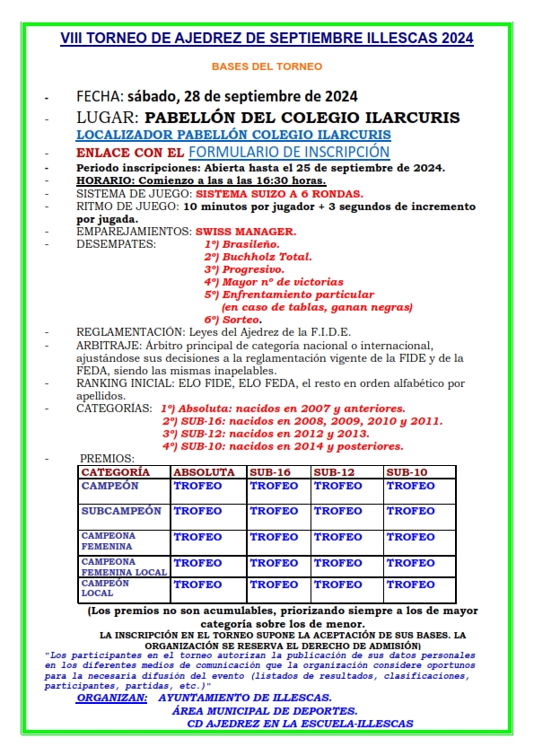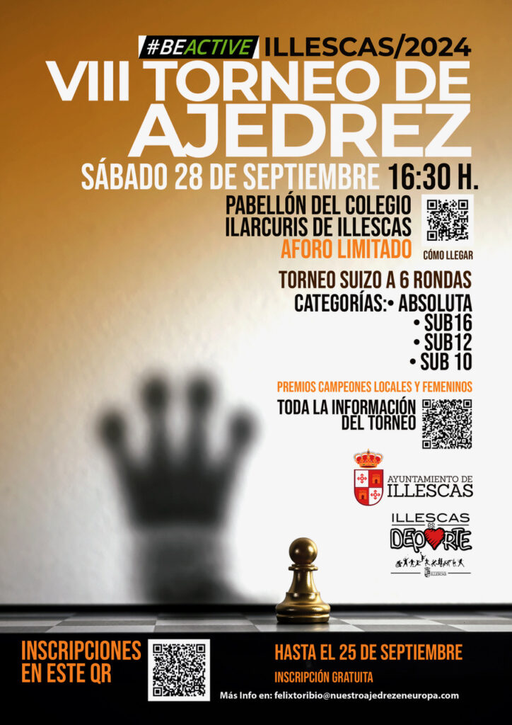 En el marco de la Semana Europea del Deporte, el pabellón del colegio público Ilarcuris LOCALIZADOR LUGAR DE JUEGO acogerá la VIII edición del torneo de ajedrez de Illescas el sábado 28 de septiembre. Las inscripciones están disponibles en este ENLACE CON EL FORMULARIO