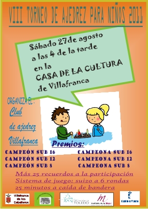 Para poner cierre a la temporada de verano en nuestra escuela de Villafranca, el próximo sábado 27 de agosto a partir de las 4 de la tarde, se celebrará la 8ª edición del Torneo de Ajedrez para Niños. Participarán los 26 chicos y chicas inscritos durante el periodo estival más el resto de alumnos y alumnas de las escuelas de Alcázar y Villafranca.