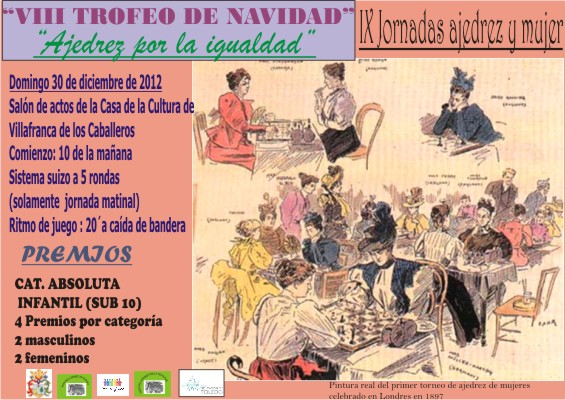 El domingo 30 de diciembre se celebrará la 8ª edición del trofeo «AJEDREZ POR LA IGUALDAD», recuperando así una de las actividades más características promovidas por nuestro proyecto desde que hace 9 años el club impulsará las jornadas «ajedrez y mujer», con la presencia inaugural de la entonces campeona de Europa Pía Cramling. El torneo estará dividido en 2 categorías (absoluta e infantil sub-10) y se disputará en horario de mañana. Los premios consistirán en 4 trofeos por categoría, 2 masculinos y 2 femeninos. Las inscripciones podrán realizarse hasta el 28 de diciembre mediante correo electrónico a felixtoribio@terra.es indicando el nombre y apellidos, edad, elo y lugar de procedencia. ¡¡OS ESPERAMOS A TODOS!!