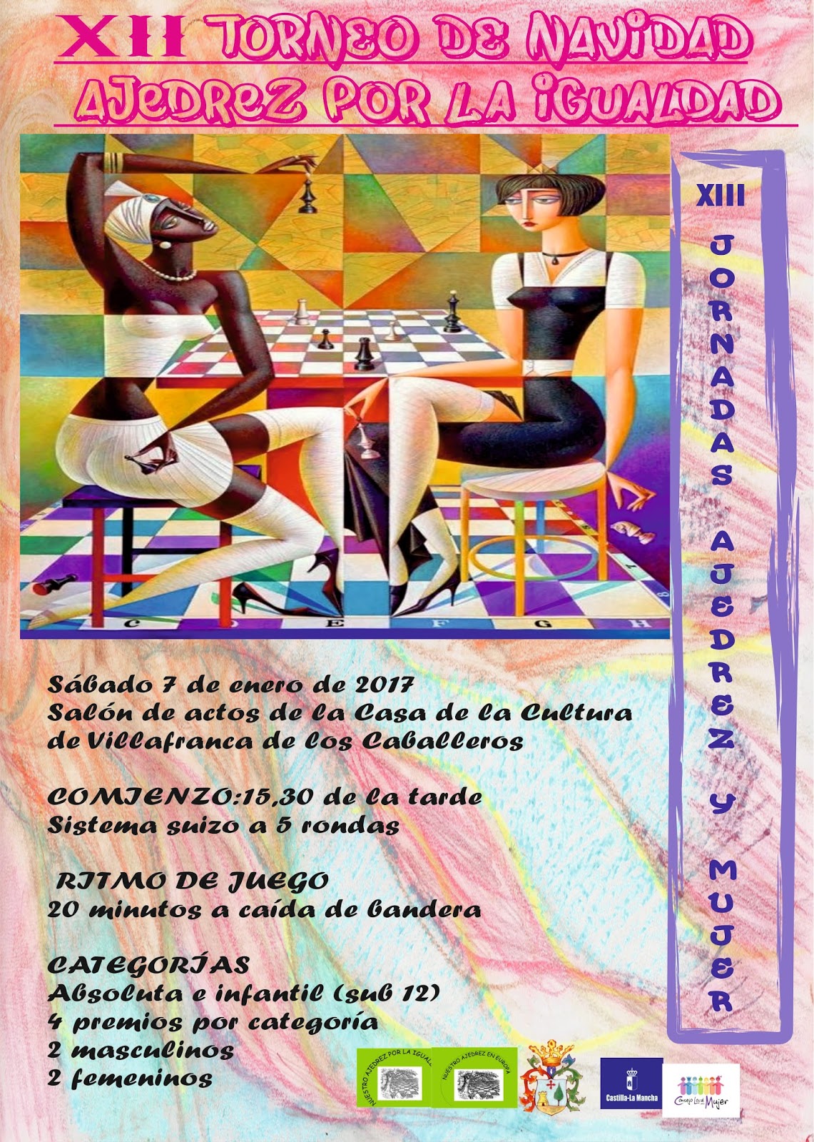 El sábado 7 de enero a primera hora de la tarde, las 15,30h, comenzará el Torneo de Ajedrez por la Igualdad. La casa de la cultura de Villfranca recibirá a los aficionados que quieran acompañarnos ese primer sábado de 2017. Las condiciones de inscripción y las bases del torneo las publicamos a continuación.