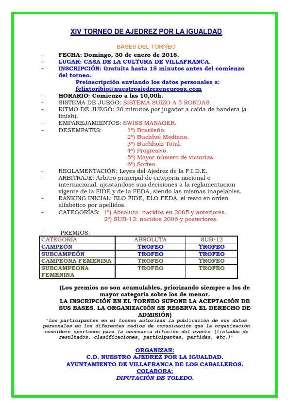 El domingo 30 de diciembre a las 10 de la mañana se disputará el XIV TORNEO DE NAVIDAD AJEDREZ POR LA IGUALDAD.