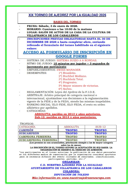 El sábado 3 de enero de 2026 tendrá lugar la 19ª edición del Torneo «Ajedrez por la Igualdad». Comenzará a las 10 de la mañana y se jugarán 6 rondas a un ritmo de 10 minutos + 3 segundos de incremento por movimiento. Las inscripciones están abiertas escaneando el QR del cartel, pulsando sobre el acceso al formulario de las bases o a través del siguiente enlace: