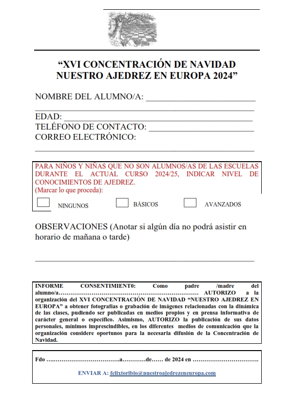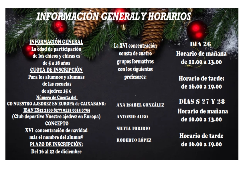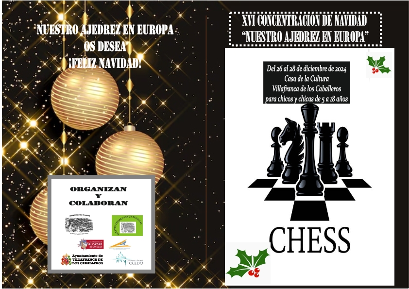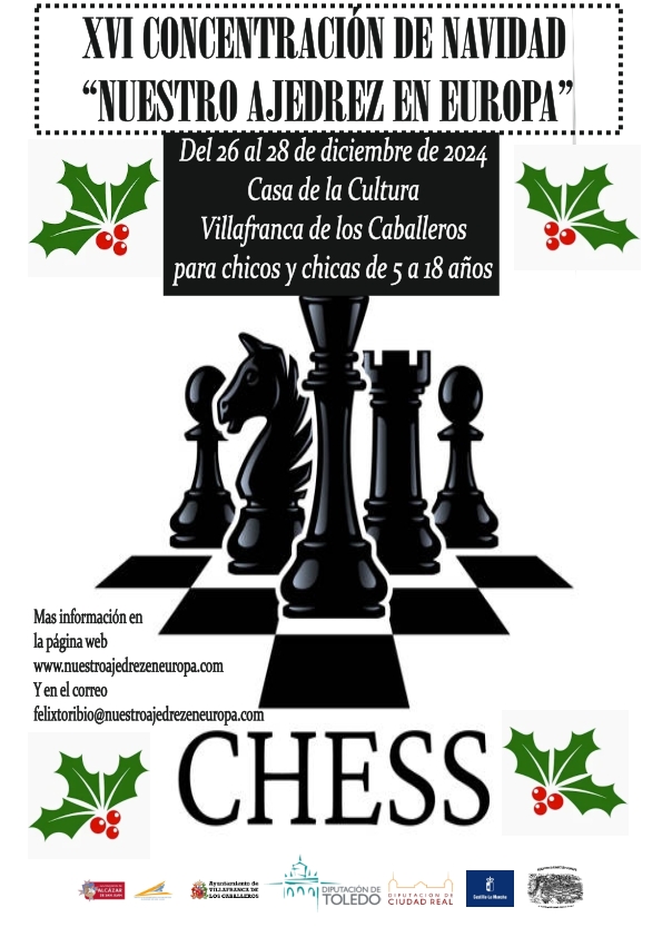 Del 26 al 28 de diciembre se celebrará una nueva edición de nuestra Concentración de Navidad. Este es una de las actividades formativas anuales ligadas al proyecto Nuestro Ajedrez en Europa. Como en años pasados las clases tendrán lugar en la casa de la cultura de Villafranca de los Caballeros y pueden participar el alumnado de nuestras escuelas de ajedrez y chicos y chicas que no perteneciendo a las mismas quieran tener un primer contacto.