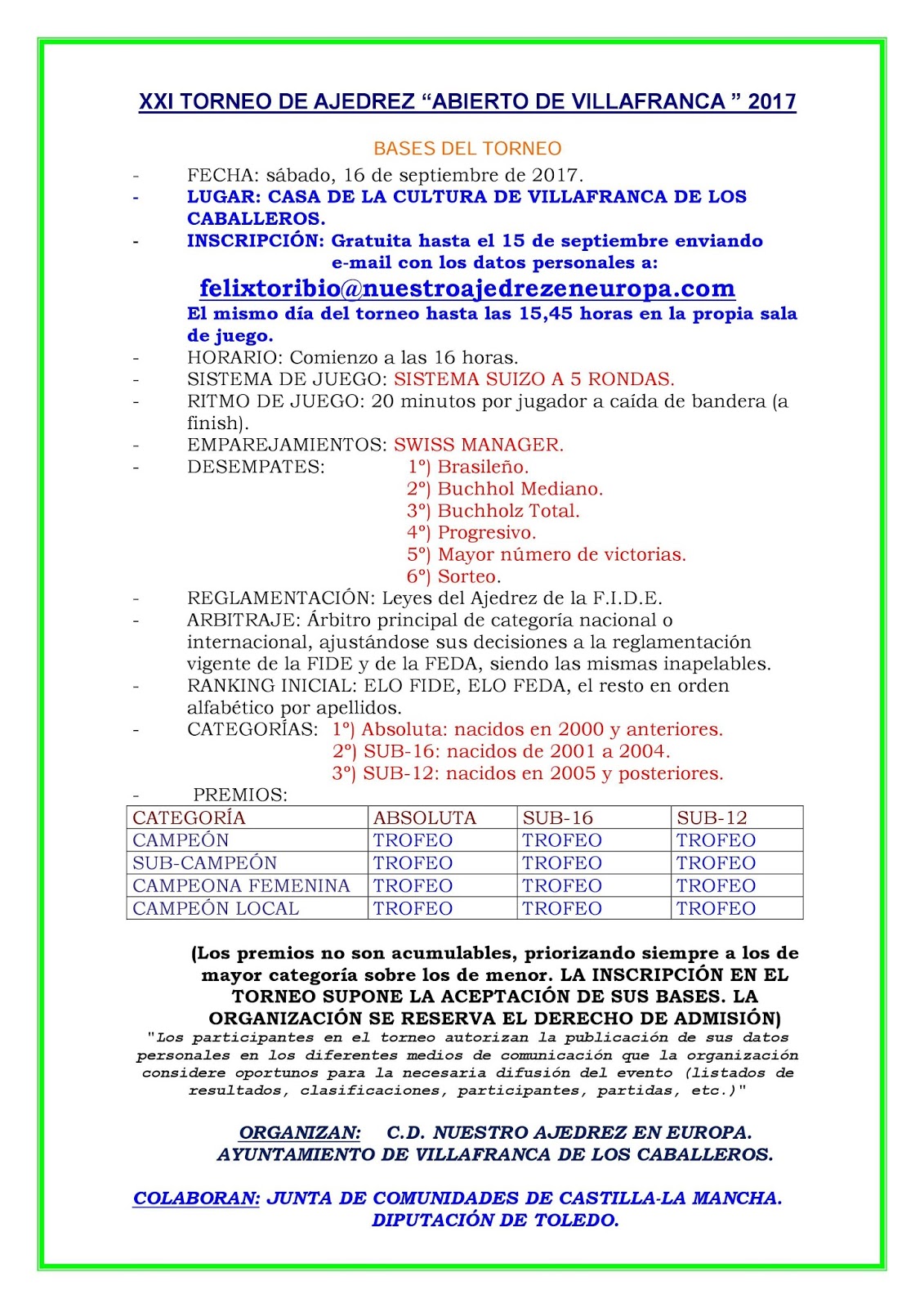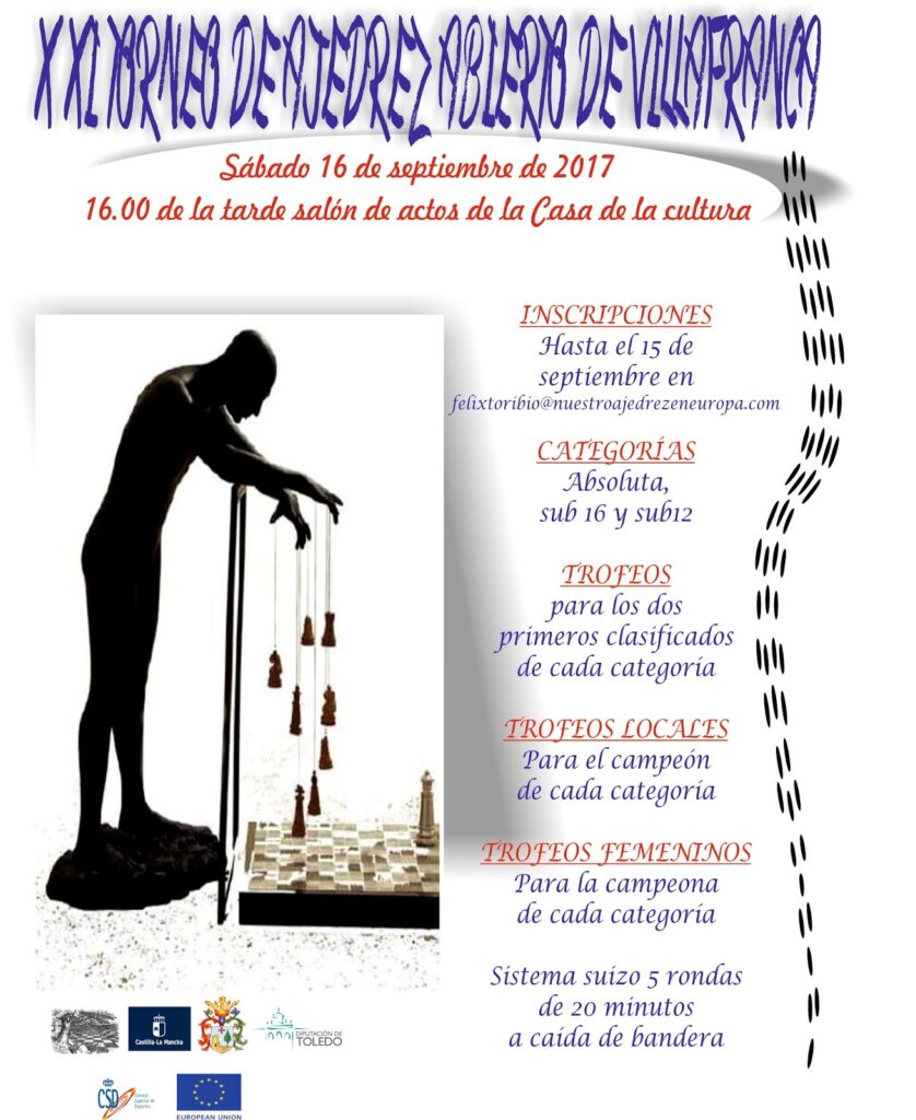 Aquí tenéis la información sobre el próximo torneo de ajedrez de Villafranca. Será el sábado 16 de septiembre en jornada de tarde, con comienzo a las 16 horas en el salón de actos de la casa de la cultura. Las inscripciones pueden realizarse hasta el 15 de septiembre en el correo electrónico que figura en el cartel y en las bases del torneo que publicamos. Se entregarán 12 trofeos, repartidos entre las categorías: absoluta, sub-16 y sub-12.